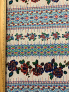 -Red, Blue, Green, Turquoise, & Black Floral & Dot Horizontal Stripe Print on White Rayon Challis Fabric