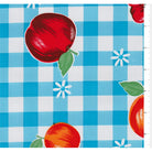 Red, Orange, Green, Brown, and White Apples, Cherries, Peaches, and Daisies on Bright Blue and White Check Oilcloth Fabric