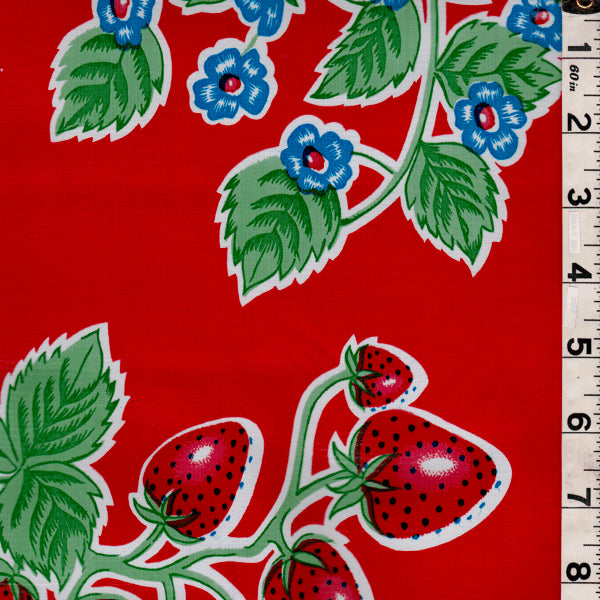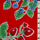 Red, Green, Black, and White Floral and Strawberry Print on Red Oilcloth Fabric