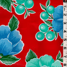 Shades of Green, Blue, and White Floral Print on Red Oilcloth Fabric