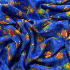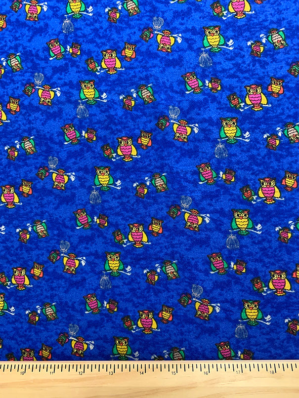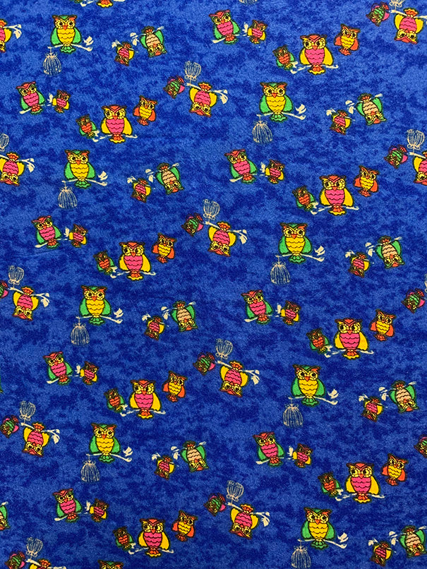 -Red, Yellow, Green, Fuschia, Orange, Beige, & Black Owl Print on Speckled Blue Rayon Challis Fabric
