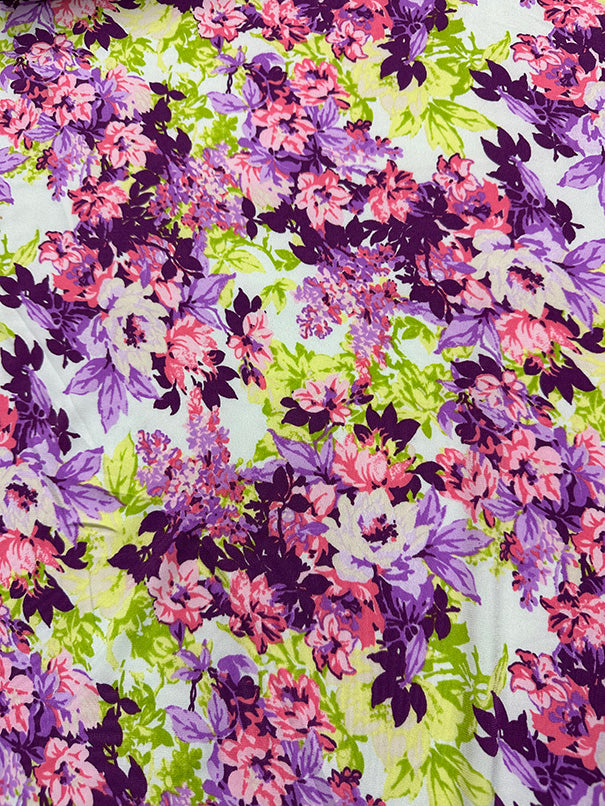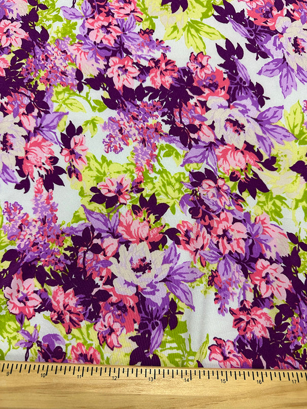 1 1/2 YD PC -Purple, Pink, Green, & Yellow Floral Print on White ITY Jersey Knit Fabric