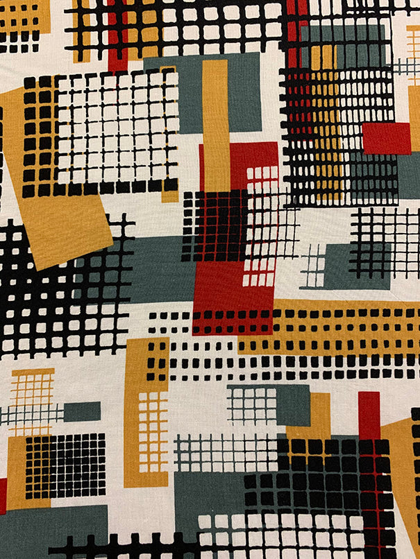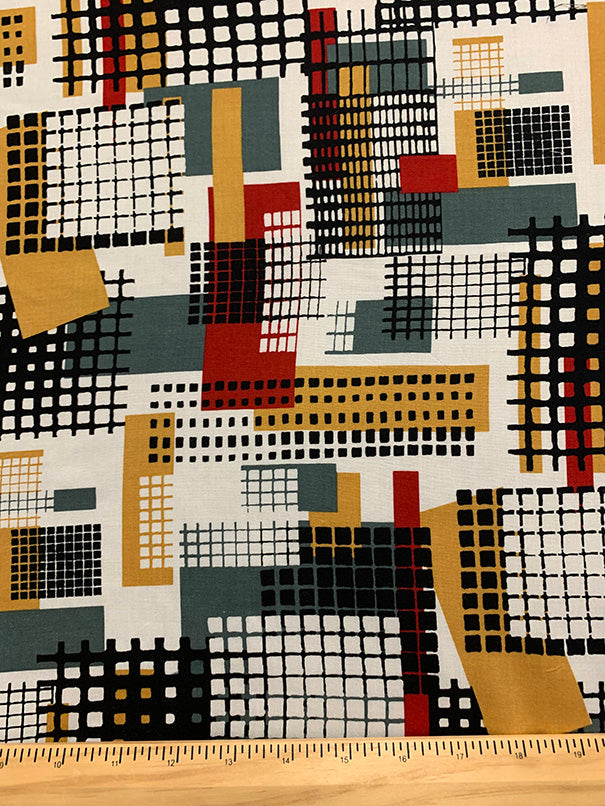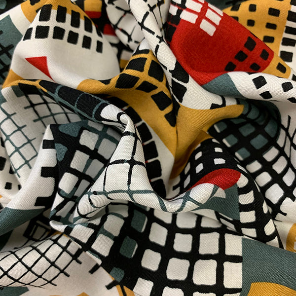 1 7/8 YD PC -Green, Gold, Red, Black, & Off White Abstract Print Rayon Challis Fabric