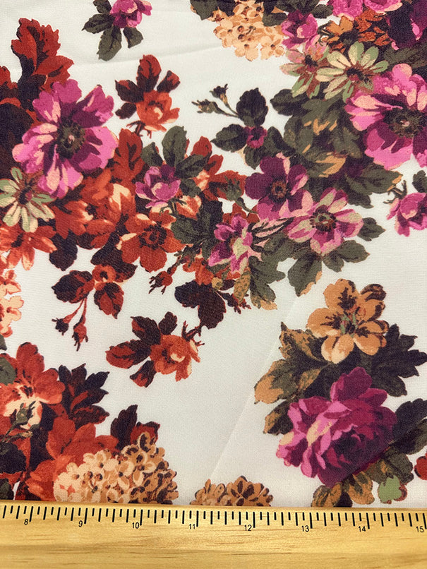 2 YD PC -Pink, Red, Peach, Green, & Dark Red Floral Print on Ivory Sheer Poly Chiffon Fabric