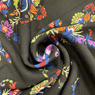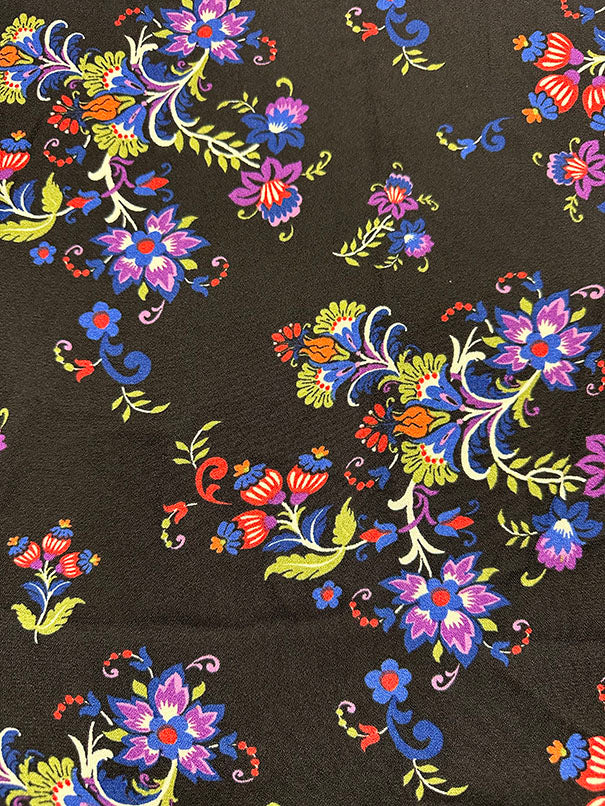 2 YD PC -Purple, White, Green, Red, Orange, & Blue Multi Floral Print on Black Dress Crepe Fabric