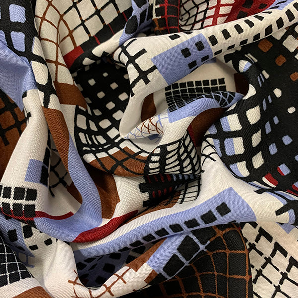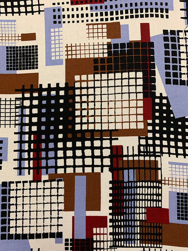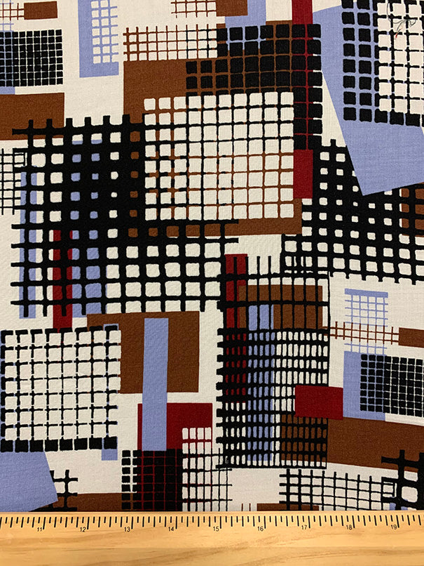 2 YD PC -Red, Blue, Brown, Black, & White Abstract Print Rayon Challis Fabric