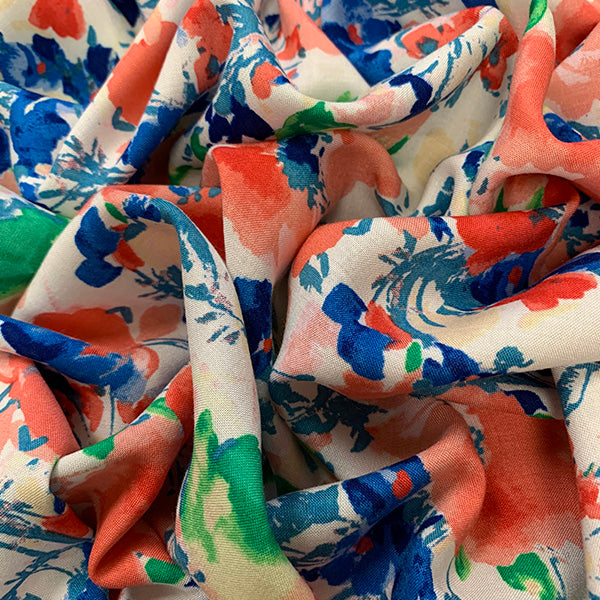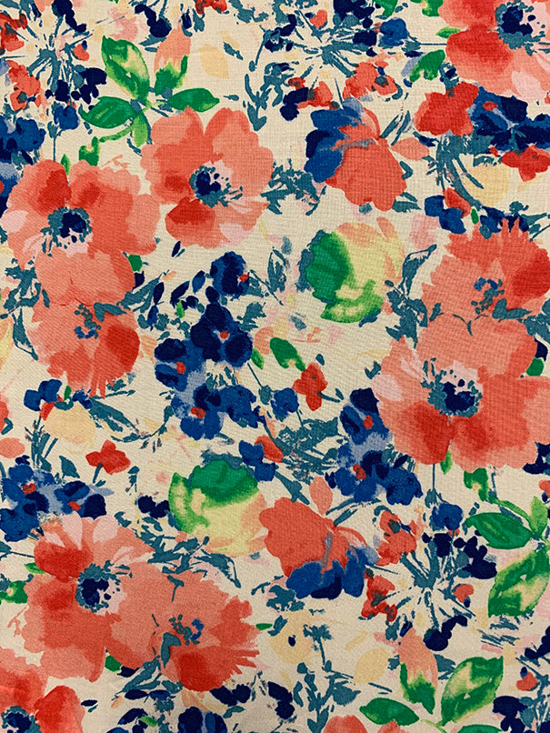 2 YD PC-White and Coral Floral Print Rayon Challis Fabric