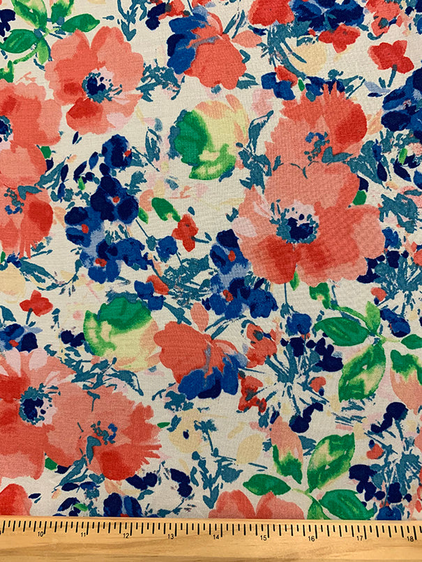 2 YD PC -White, Coral, Teal, Blue, Green, Pink, Blue, & Yellow Floral Print Rayon Challis Fabric