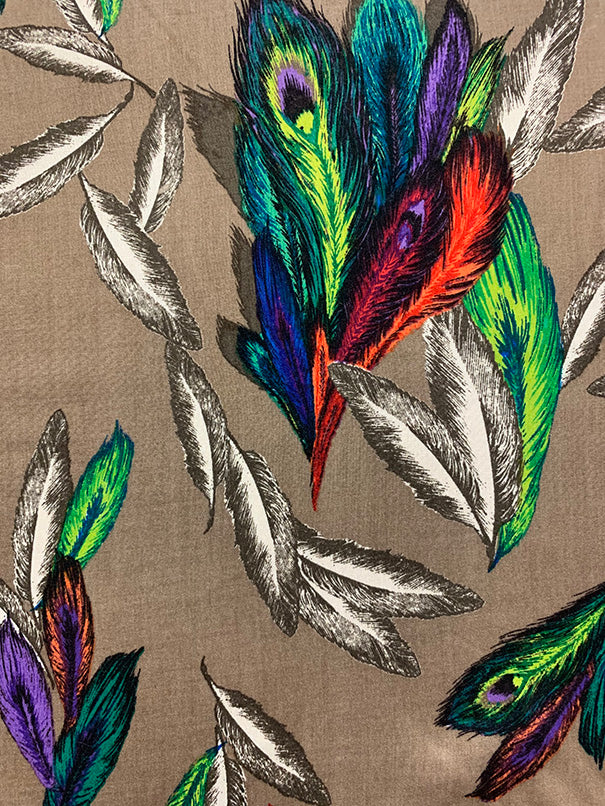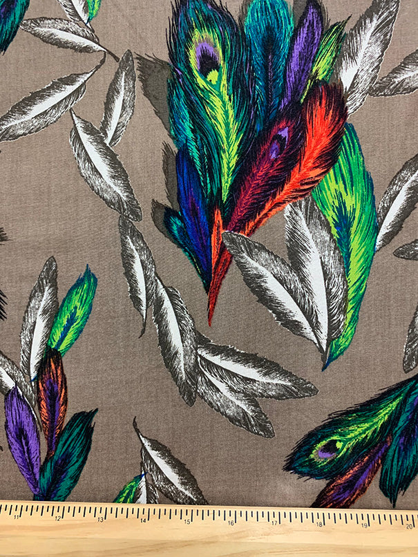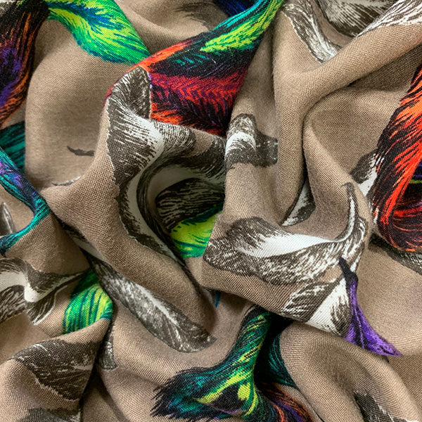 3 YD PC -Red, Orange, Purple, Green, Blue, Black, Brown, & White Multi Feather Print on Taupe Rayon Challis Fabric