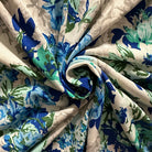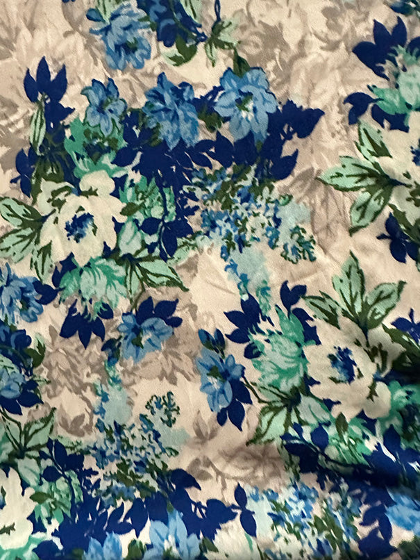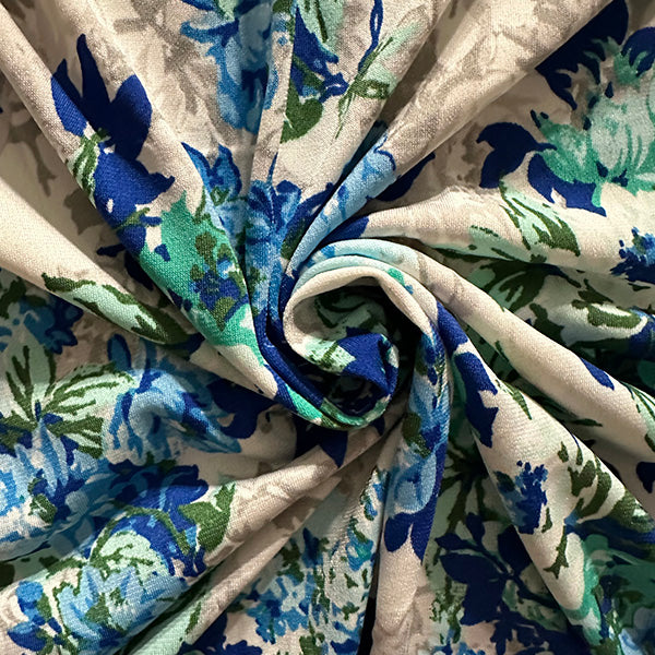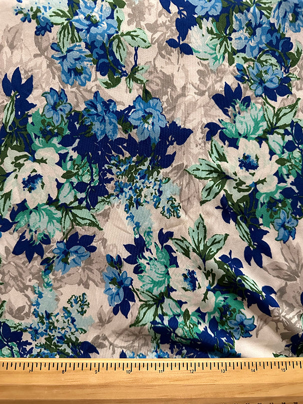 3 YD PC -Blue, Green, Gray, Teal,& Aqua Floral Print on White ITY Jersey Knit Fabric