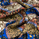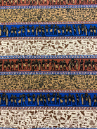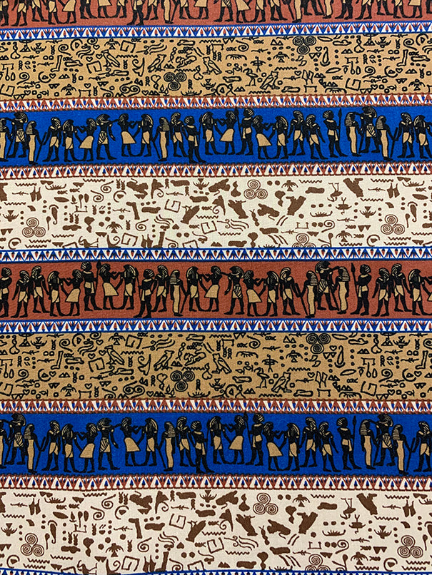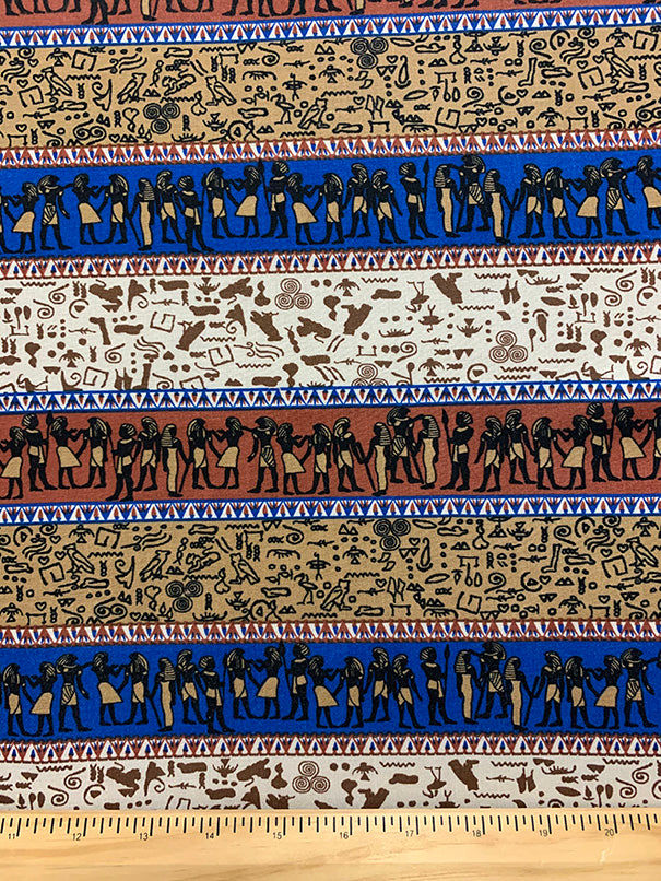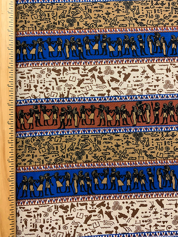 4 1/2 YD PC -Brown, Tan, Blue, White, Black, & Gold Multi Horizontal Stripe Aztec Print Rayon Challis Fabric