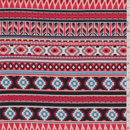 Coral orange, red, black, pale blue, wedgewood blue. ivory and beige horizontal southwest stripe print. A lightweight polyester fabric with a delicate texture and excellent drape.