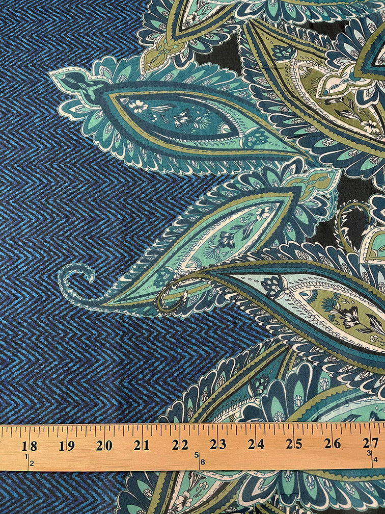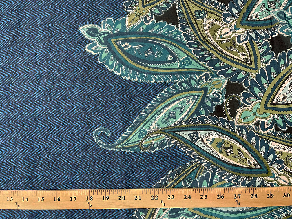 -Turquoise & Black Herringbone w/ Teal, Green, White, & Aqua Paisley Border Print Chiffon Fabric