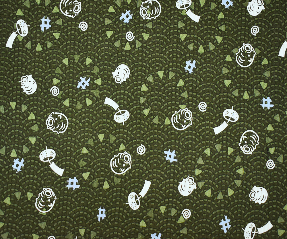 -100% cotton plain woven shirting fabric with a crinkled feel printed with an abstract pattern featuring a pig-like figure abstract shapes, & more. Line if needed.