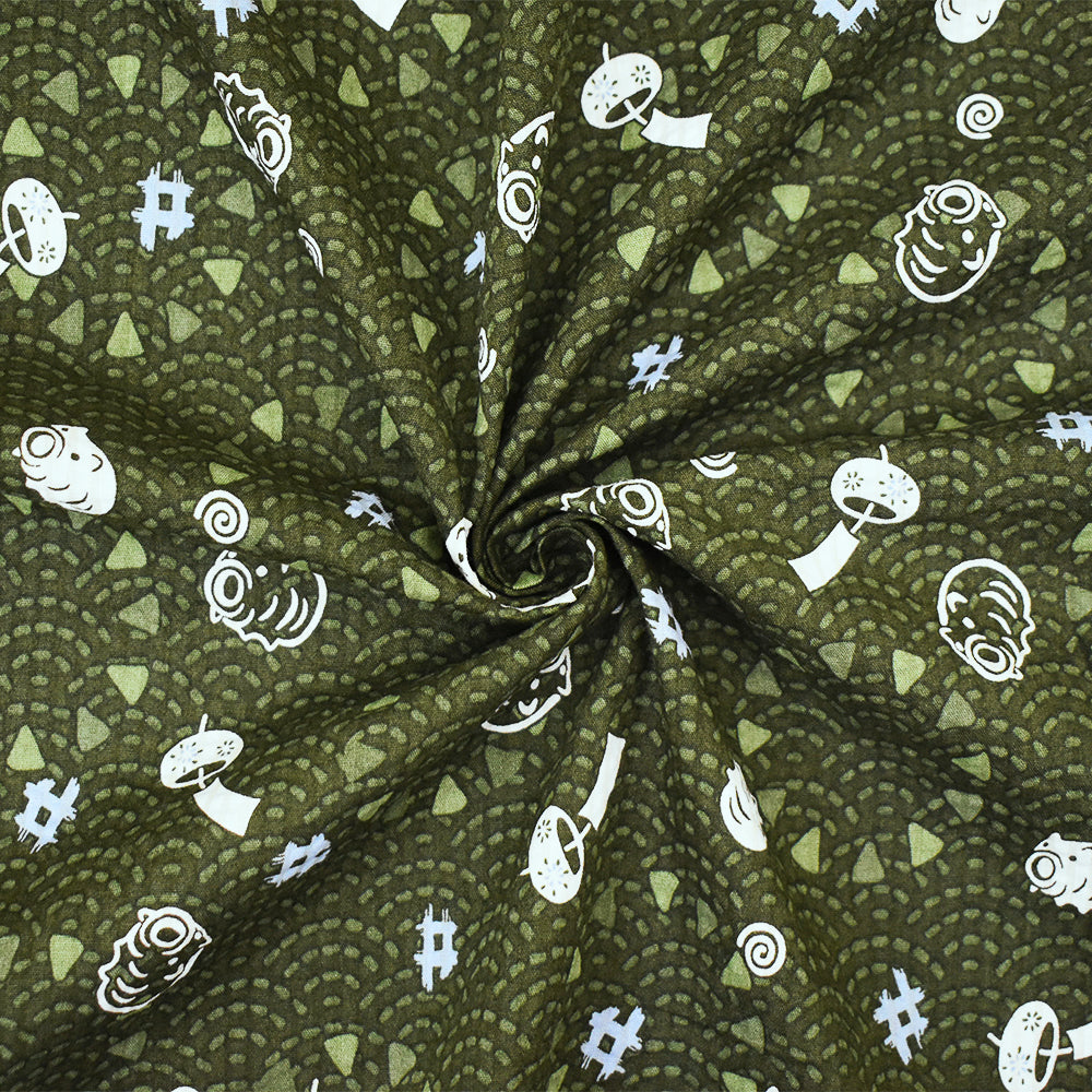 Green-Blue-Multi Abstract Pig Art Printed Crinkled Cotton Shirting Woven Fabric