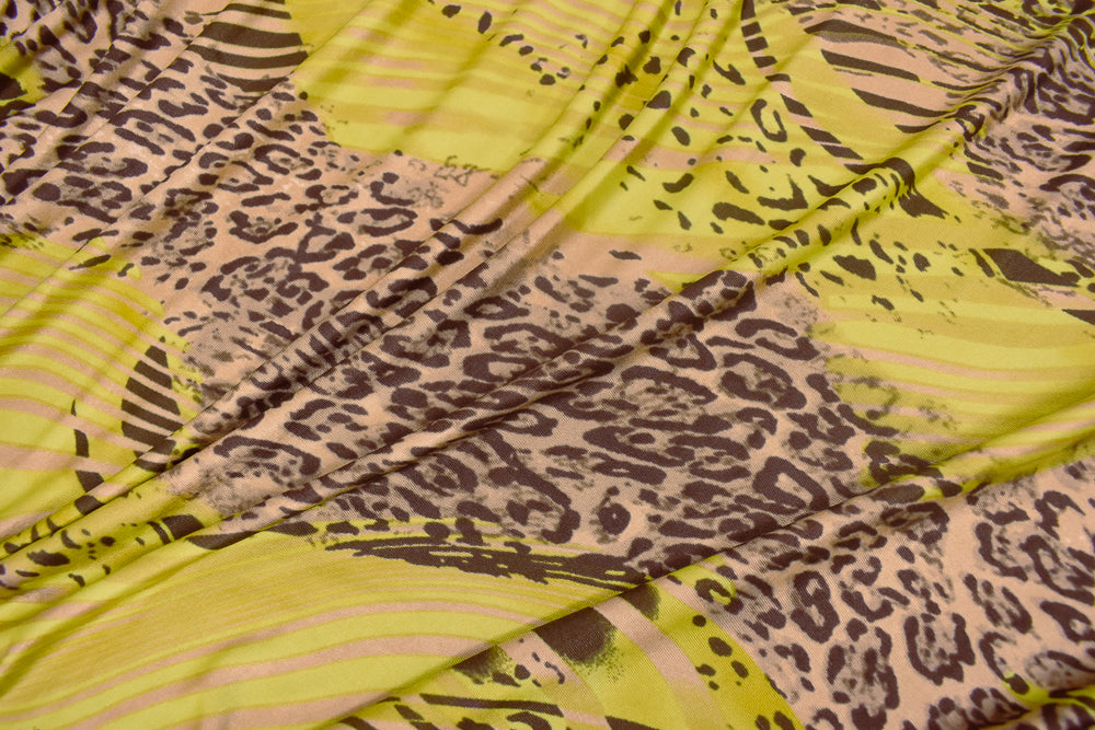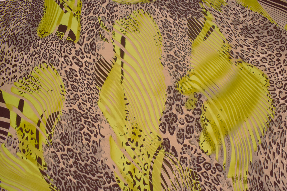 -100% silk jersey knit fabric printed with an abstract composition of cheetah pattern and zebra-like stripe elements. Line if needed.
