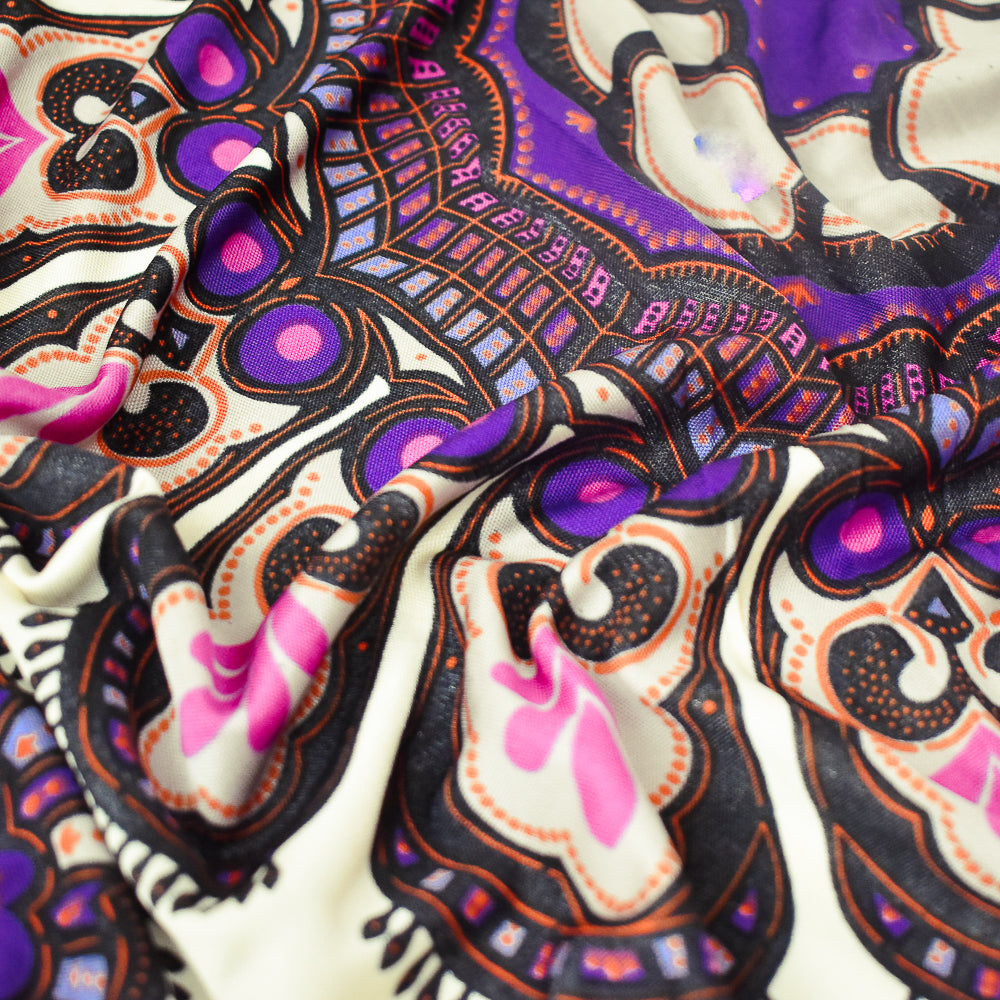 Ivory-Purple-Multi Floral Border Print Panel Silk Jersey Knit Fabric