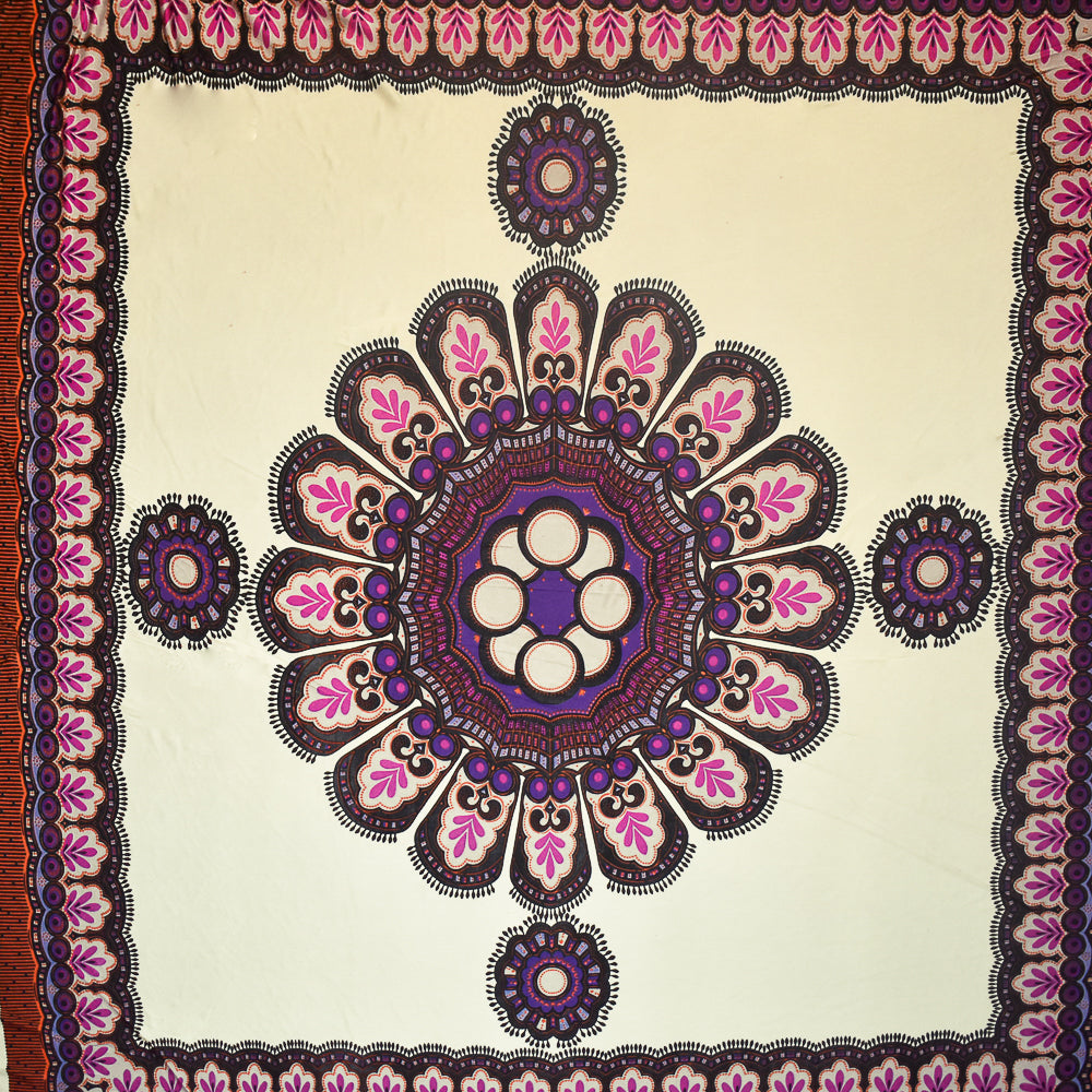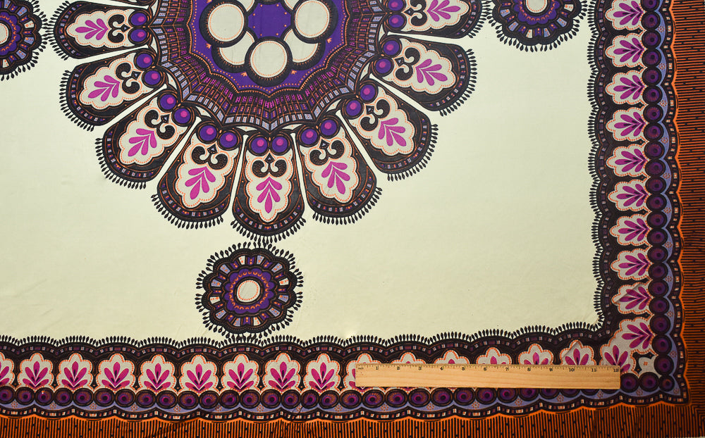 -100% silk jersey knit fabric printed with a border, and elements of floral and mandala elements. Please note that this is sold in panels, ideal for scarves. One piece will have a bordered art that is approximately 42" x 44" inches on a approx. 45"x 45" Panel Cut.