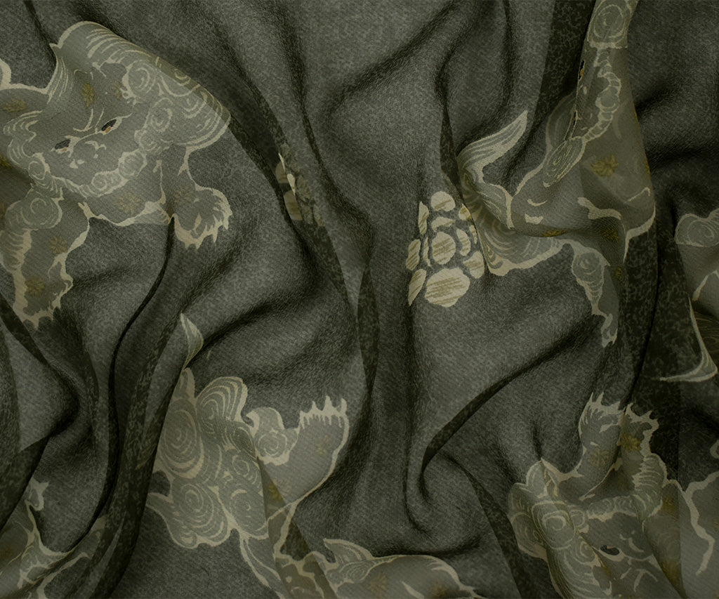 -100% silk chiffon printed with an Asian inspired pattern with folklore-like creatures