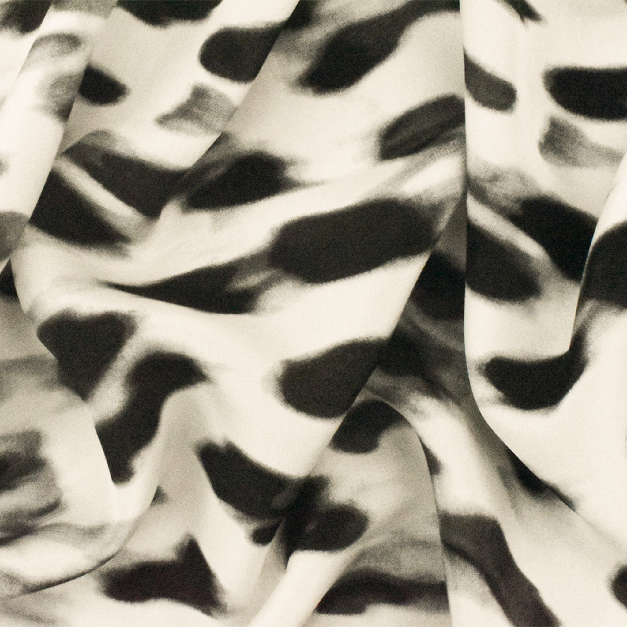 -12 mm, famous designer 100% silk crepe de chine printed with an abstract water color stylized animal print pattern. Line if needed.