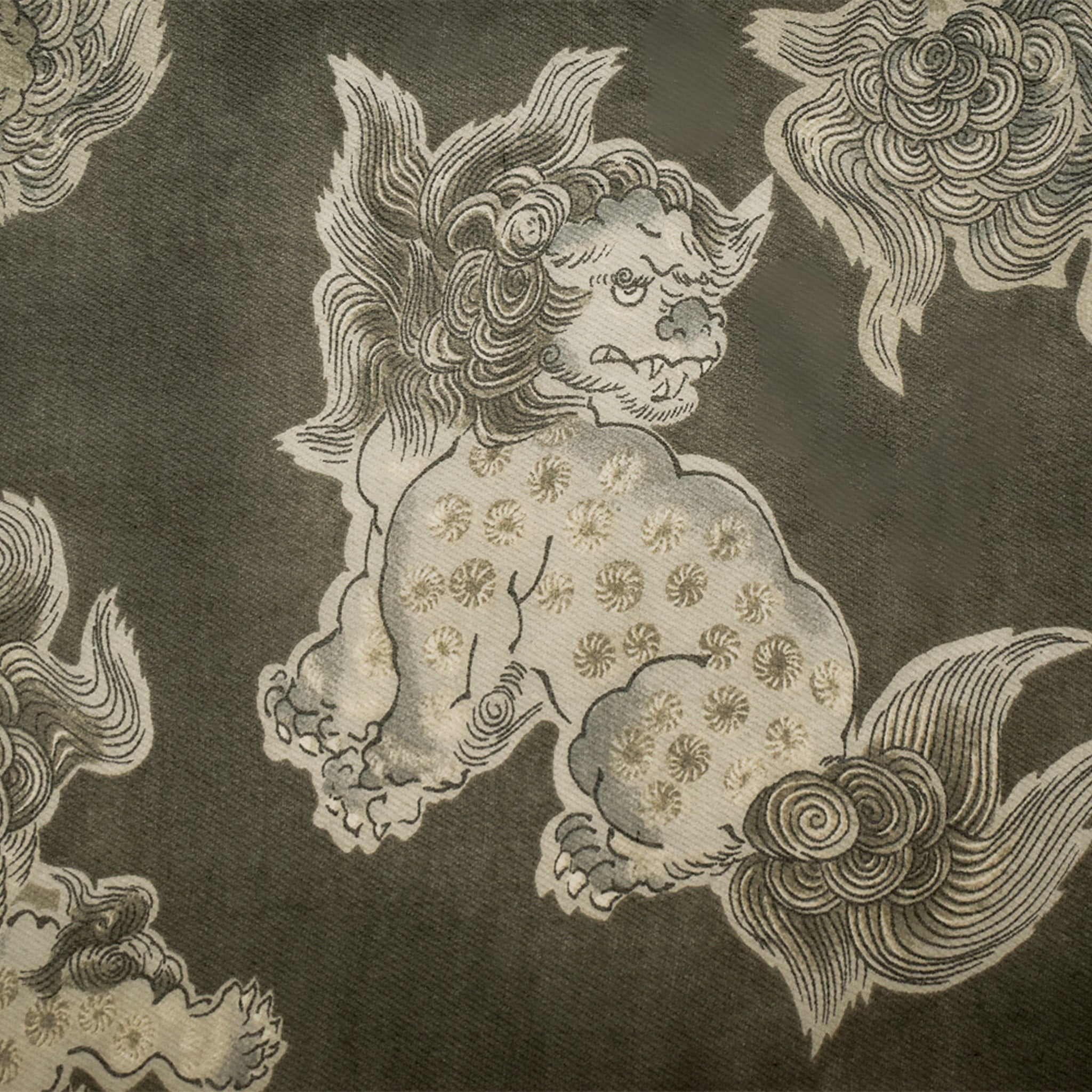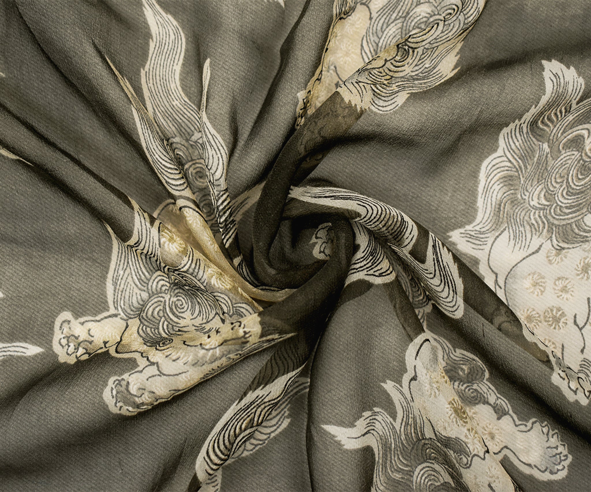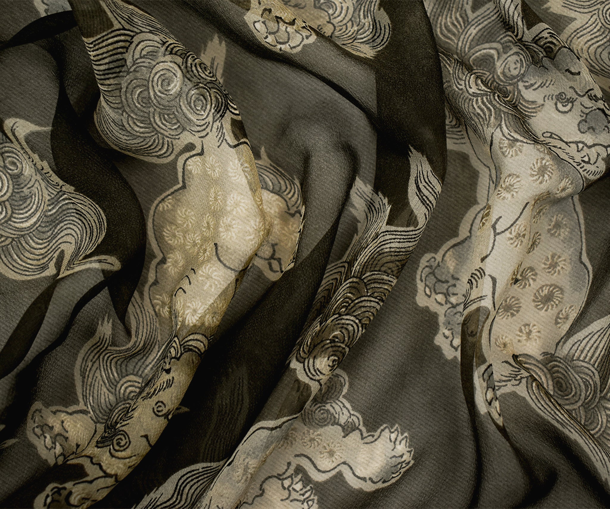 -100% silk chiffon printed with an Asian inspired pattern with folklore-like creatures