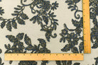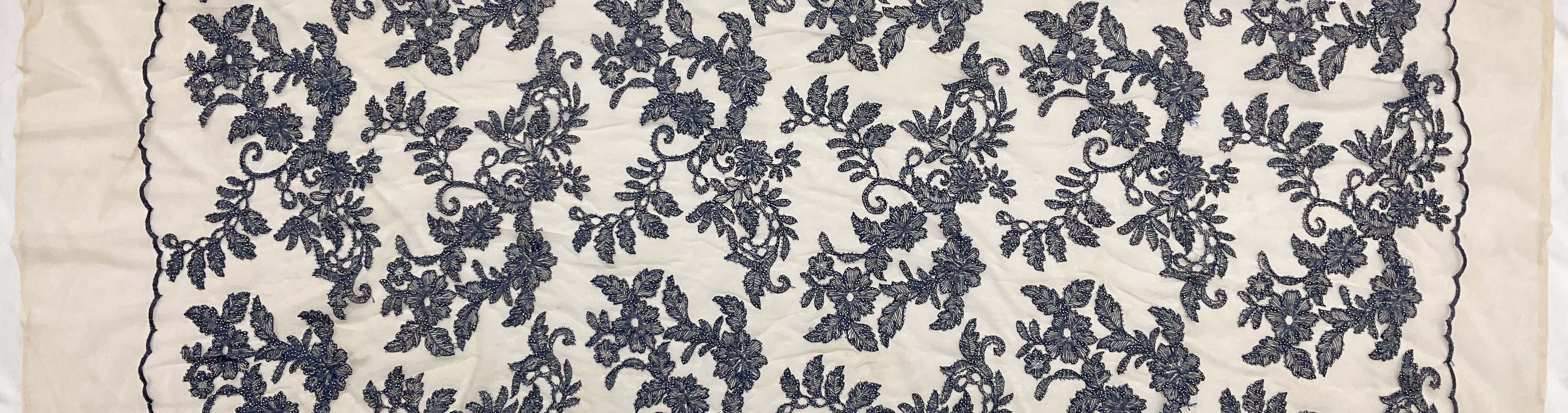 -Embroidered floral and scallop bordered pattern with beads on a mechanical stretch 100% polyester mesh tulle knit fabric