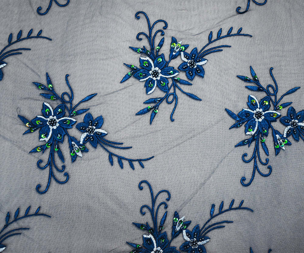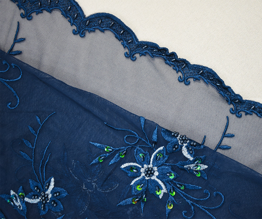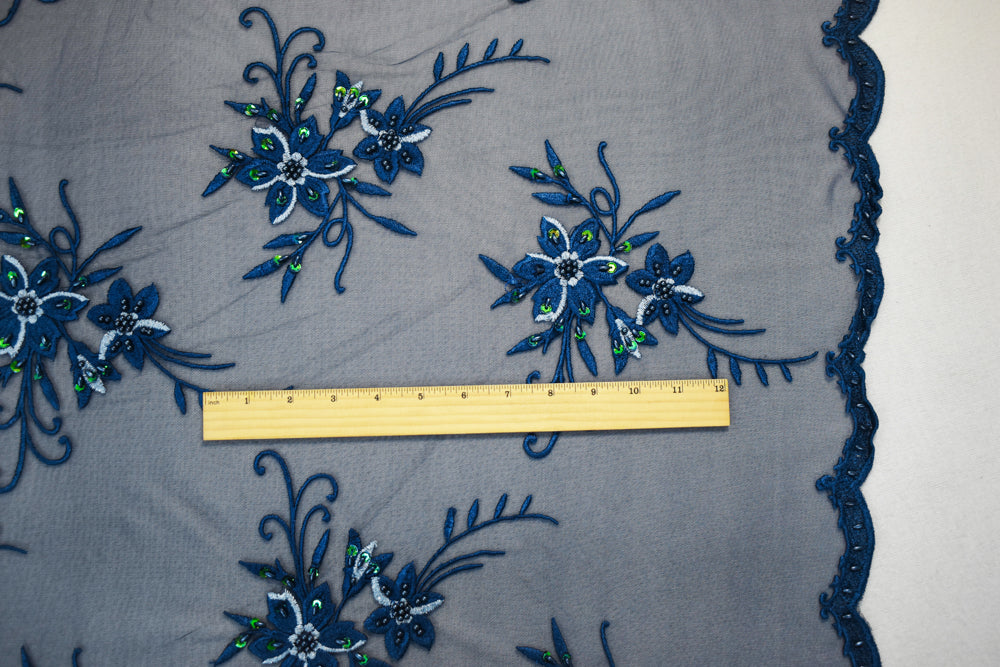 -100% Polyester scalloped selvedge mesh tulle fabric embroidered with an African inspired pattern with florals, and hints of beads and sequins for that added detail
