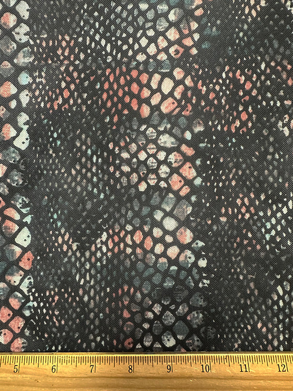 -Pink, Blue, White, & Aqua Multi Reptile Print on Black Stretch Mesh Fabric