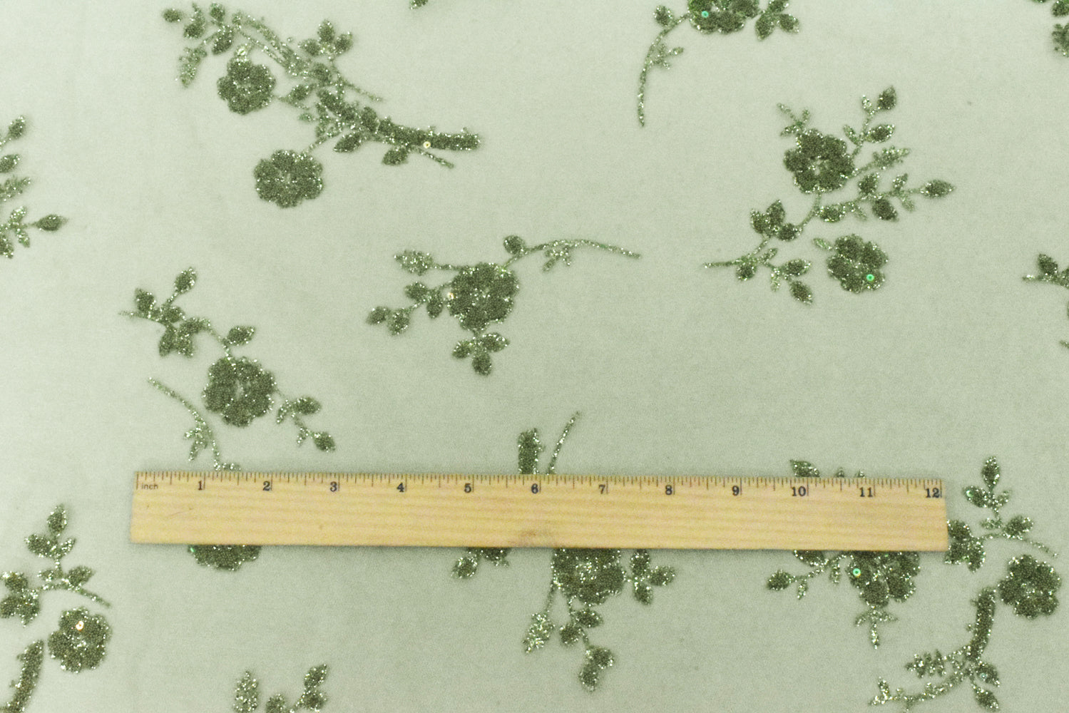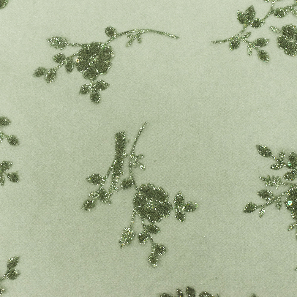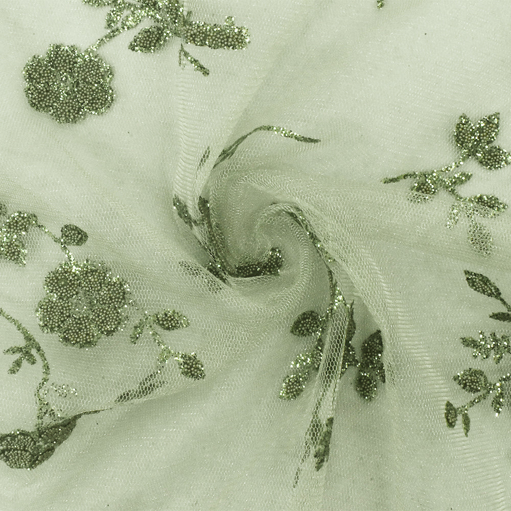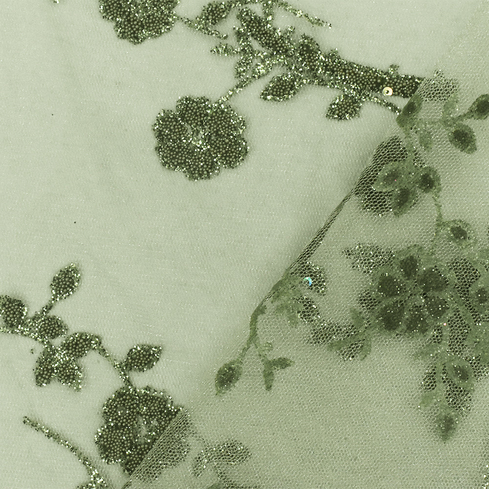Olive Green Floral Sparkles and Bead Poly Mesh Knit Fabric
