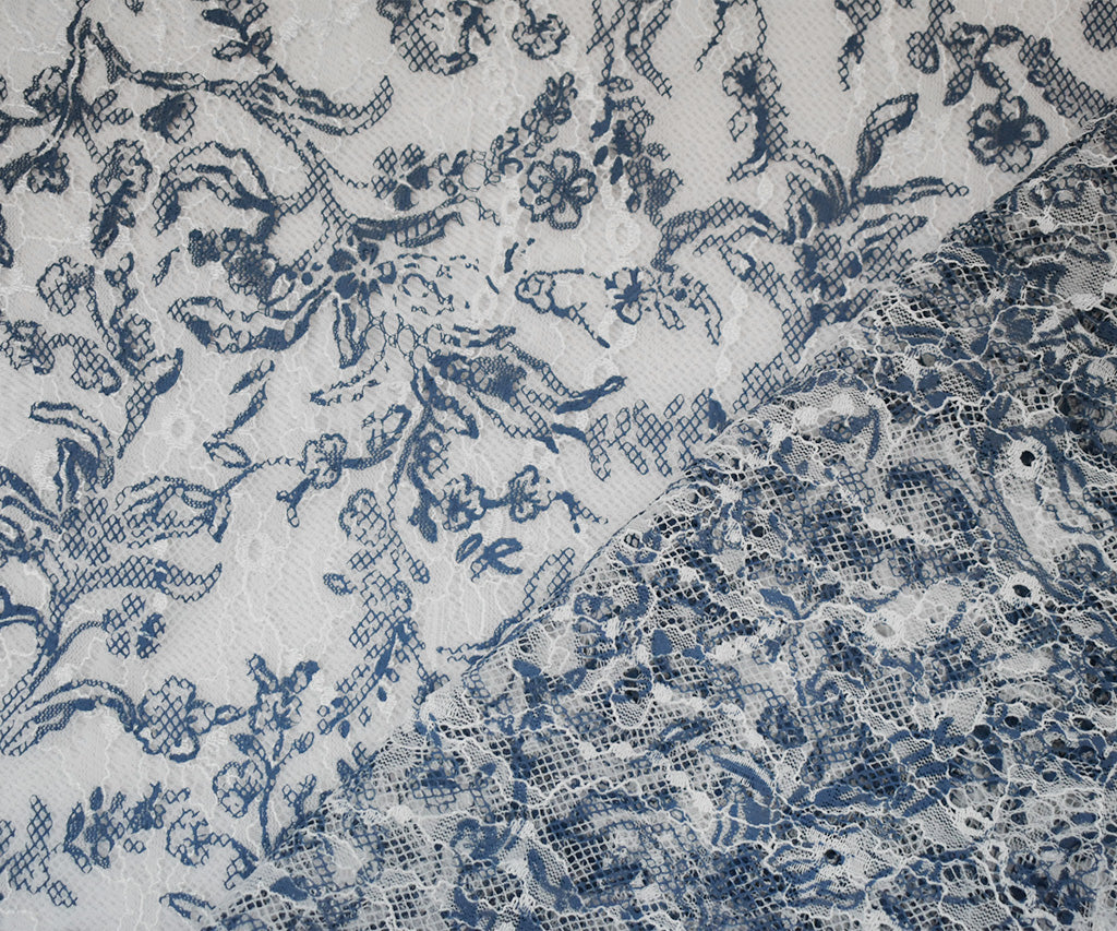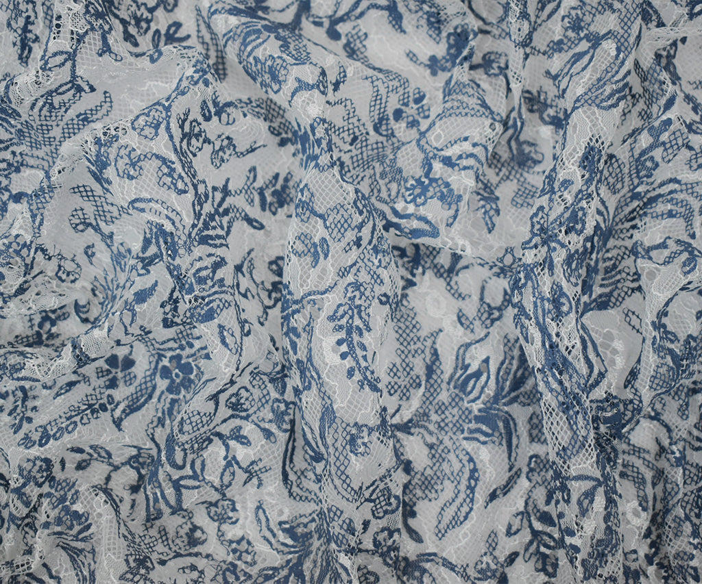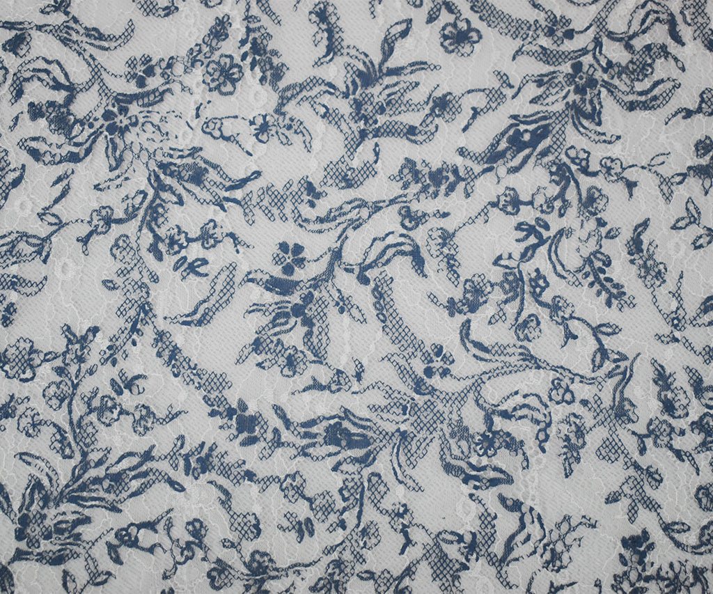 White-Blue Nylon Floral Vine Printed Lace Mesh Knit Fabric