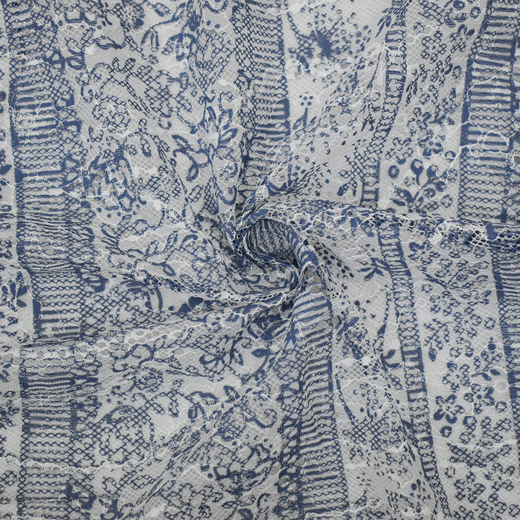 White-Blue Nylon Rayon Floral Stripe Printed Lace Mesh Knit Fabric