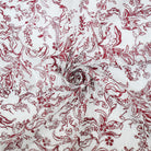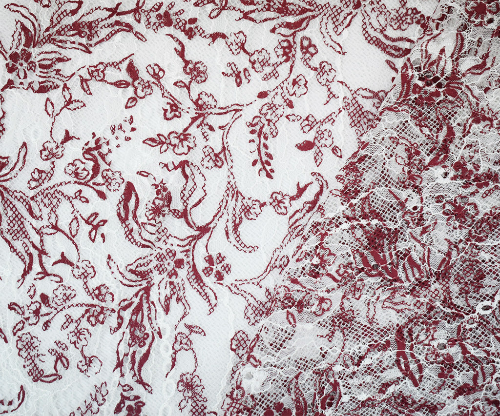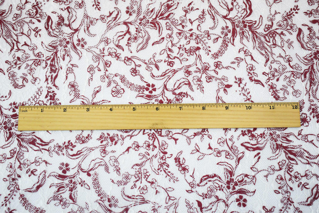 White-Deep Red Nylon Floral Vine Printed Lace Mesh Knit Fabric