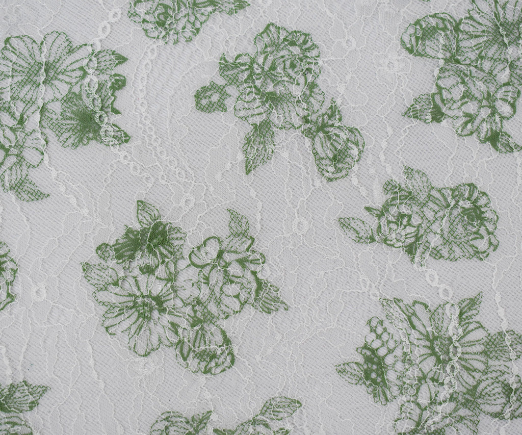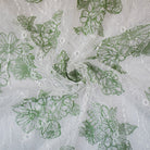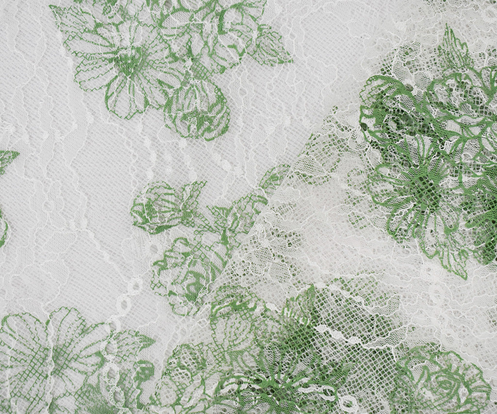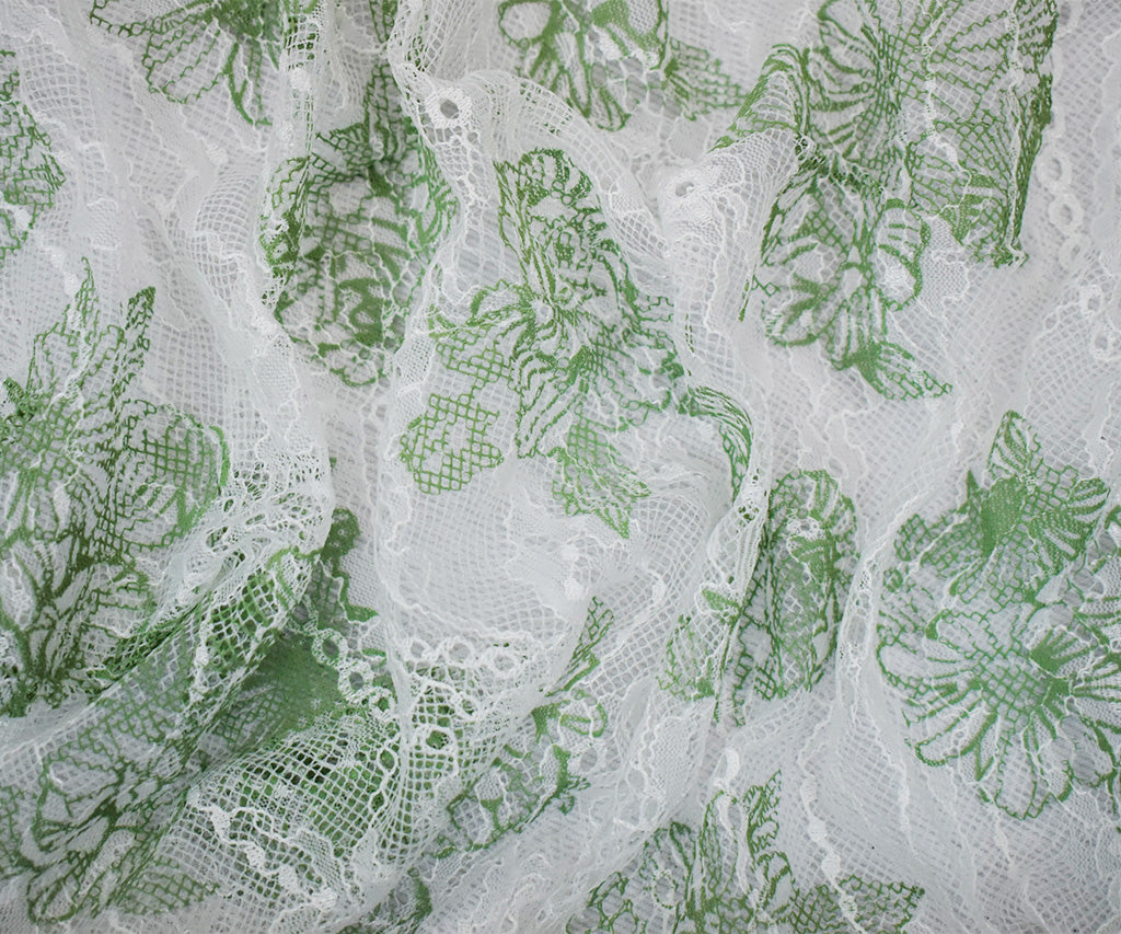 White-Green Nylon Floral Printed Lace Mesh Knit Fabric