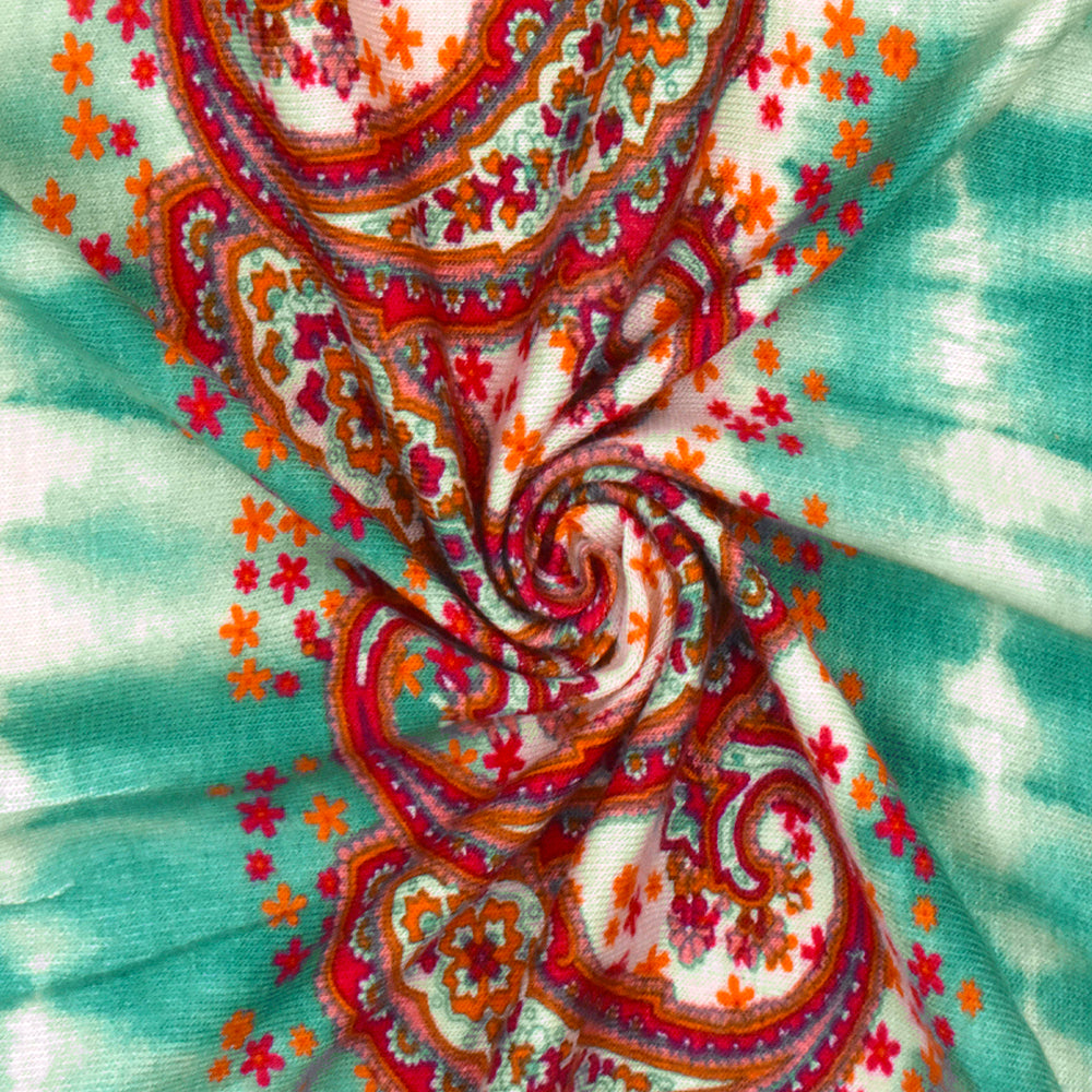 -Rayon jersey knit fabric printed with paisley, tie-dye, and floral elements in a stripe arrangement