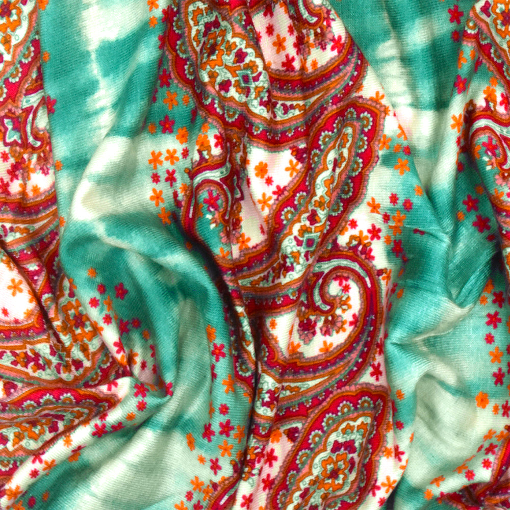 Teal-Red-Multi Striped Paisley Printed Rayon Stretch Jersey Knit Fabric