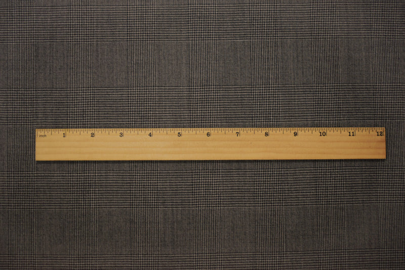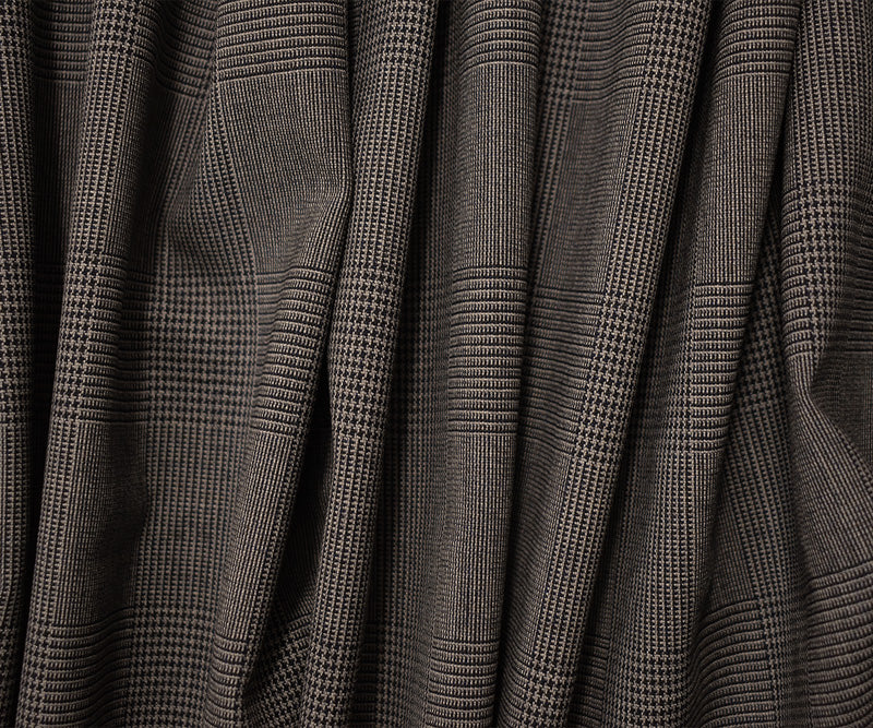 -Featuring a gray-black glen plaid pattern, this wool-poly blend is woven for durability and style. Its classic design is well-suited for structured jackets and trousers.