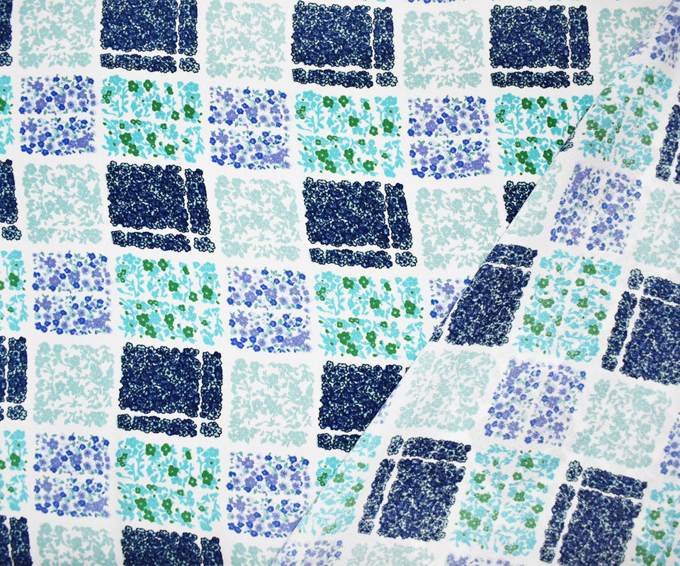 Turquoise Poly Check Floral Plaid Printed Moss Crepe Woven Fabric
