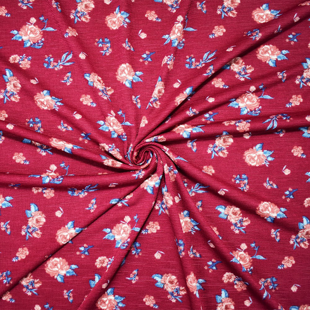 Red-Blue-Multi Poly Stretch Spandex Floral Printed Slub Knit Fabric