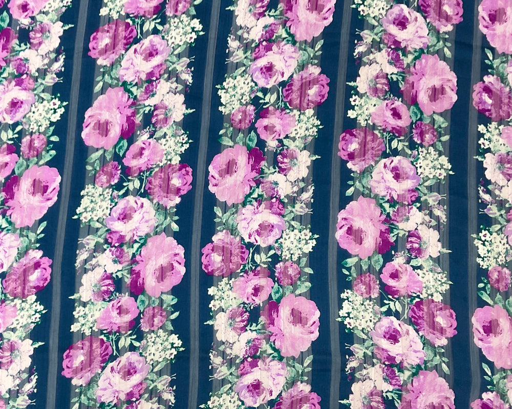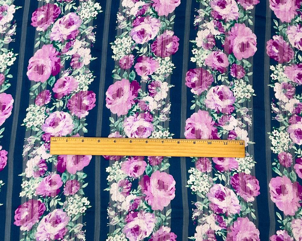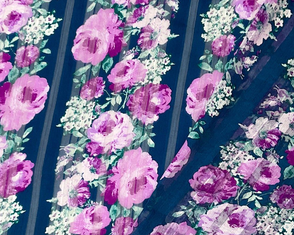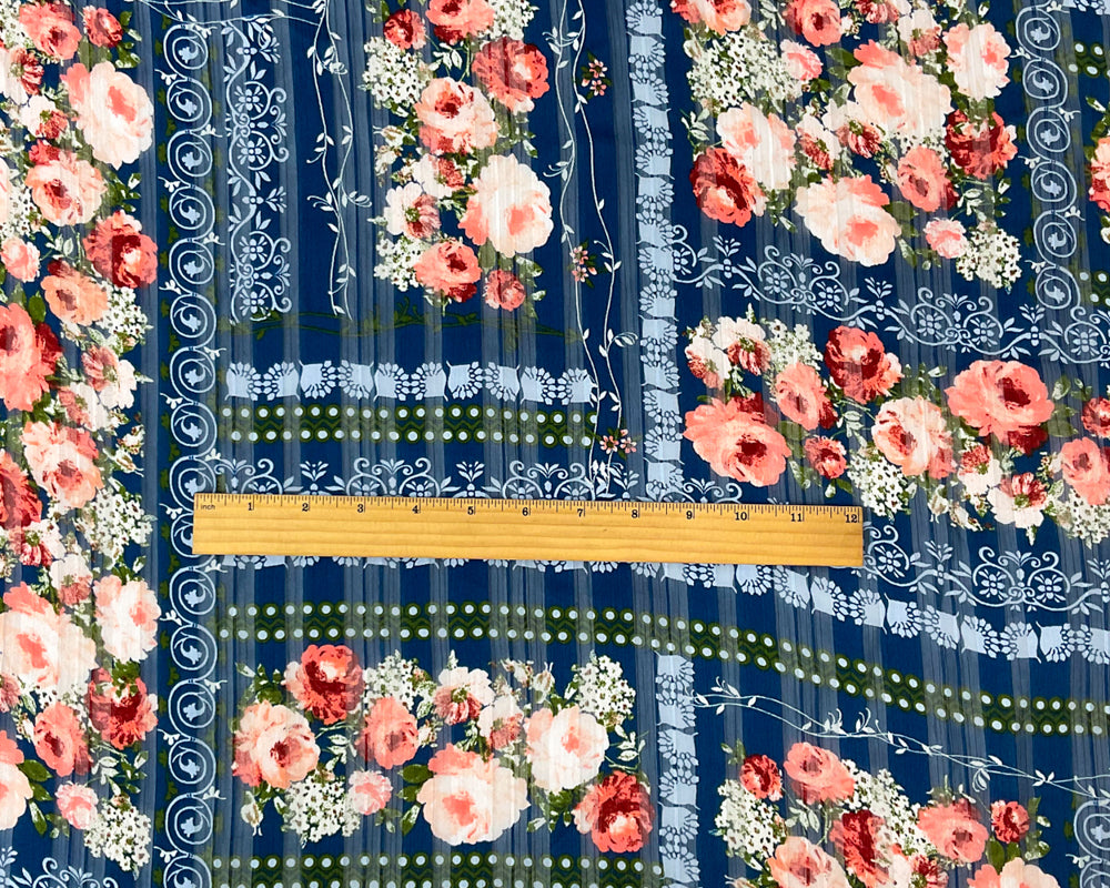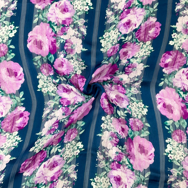 Blue-Multi Poly Stripe Floral Print Yoryu Chiffon Woven Fabric