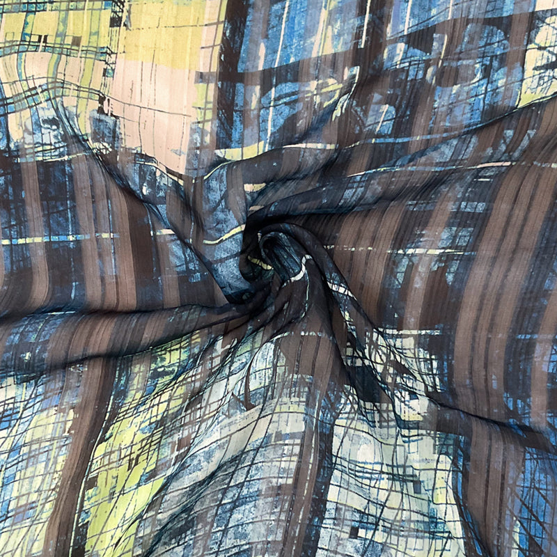 Blue-Multi Poly Abstract Print Satin Stripe Chiffon Woven Fabric
