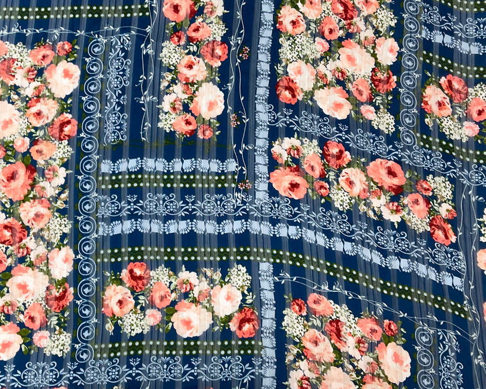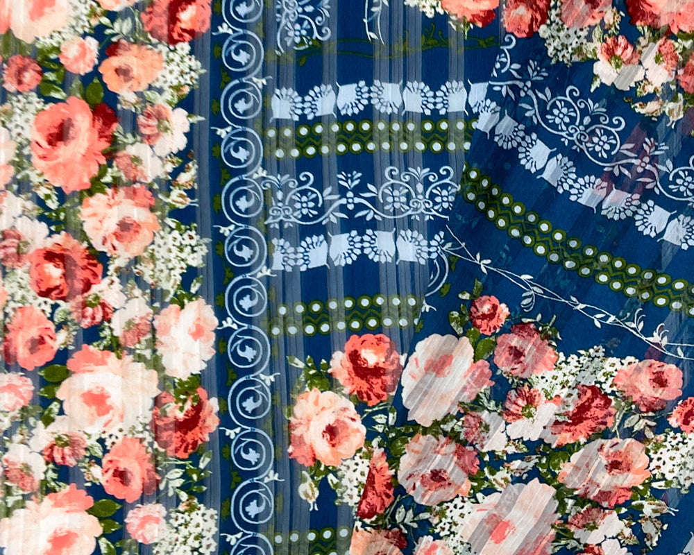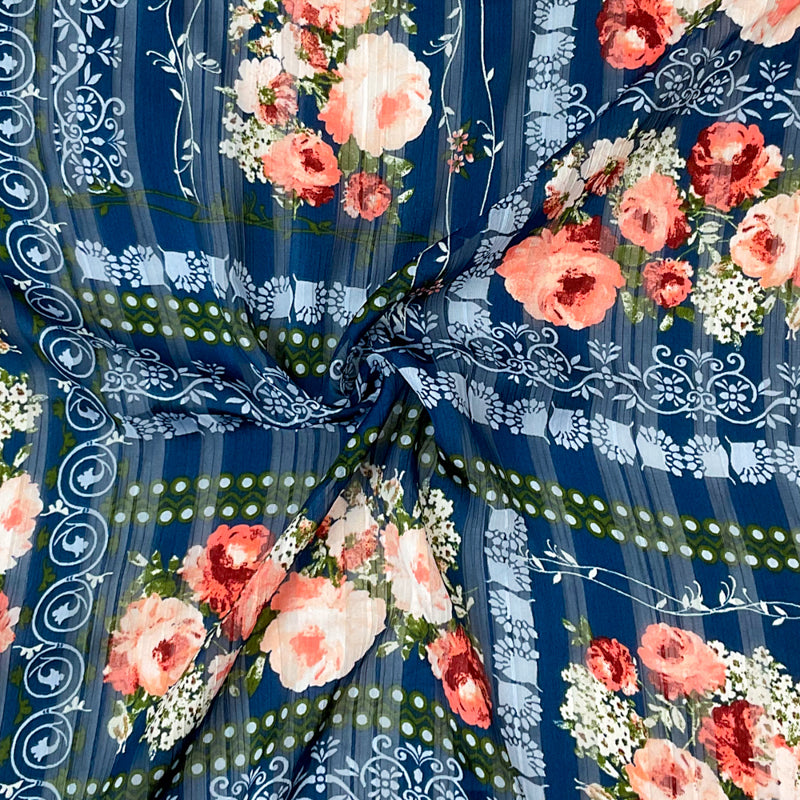 Blue-Multi Poly Floral Printed Crinkle Yoryu Chiffon Woven Fabric