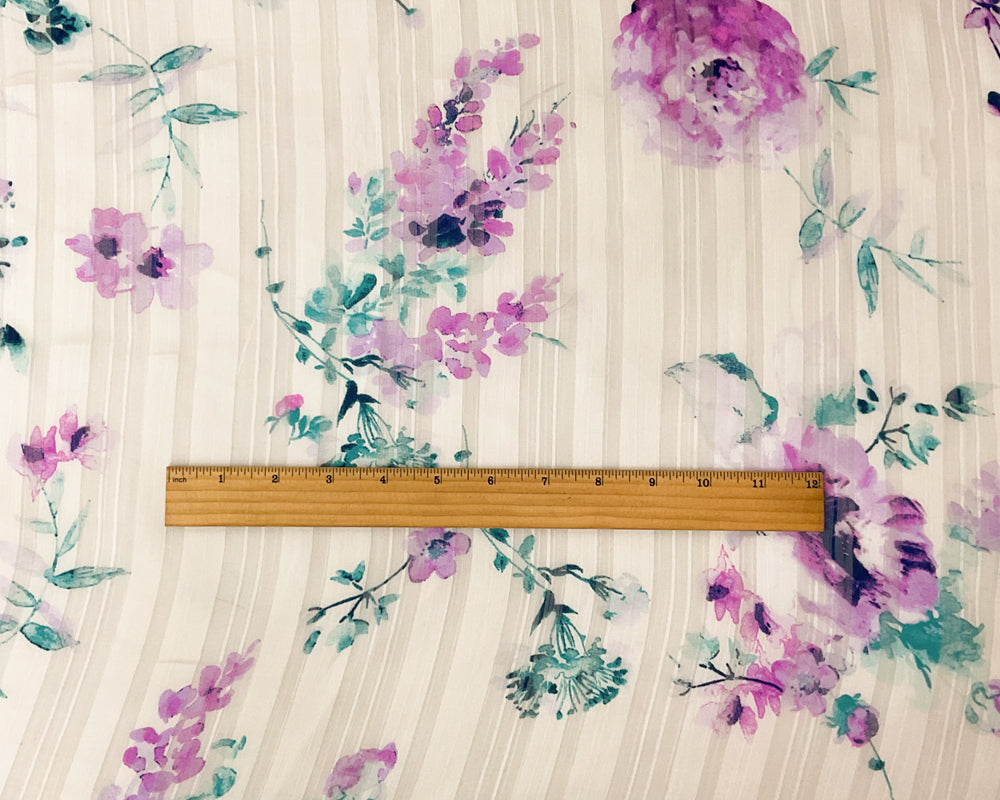 Off-White-Multi Floral Printed Satin Stripe Chiffon Woven Fabric