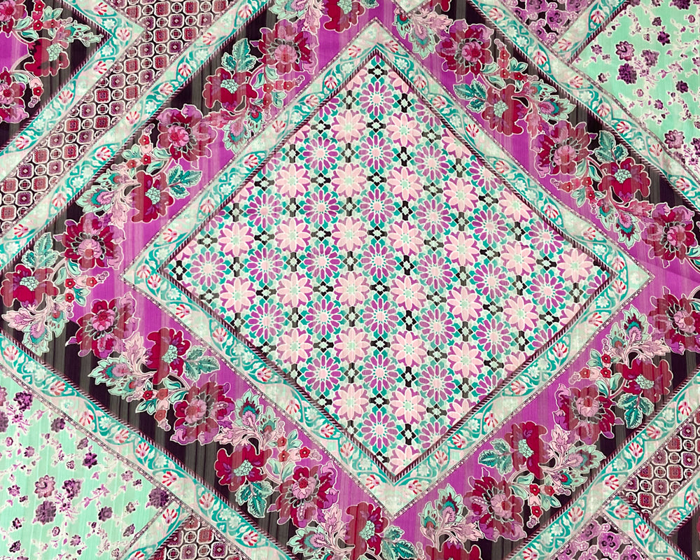 Purple-Multi Poly Patch Floral Velvet Flock Chiffon Woven Fabric