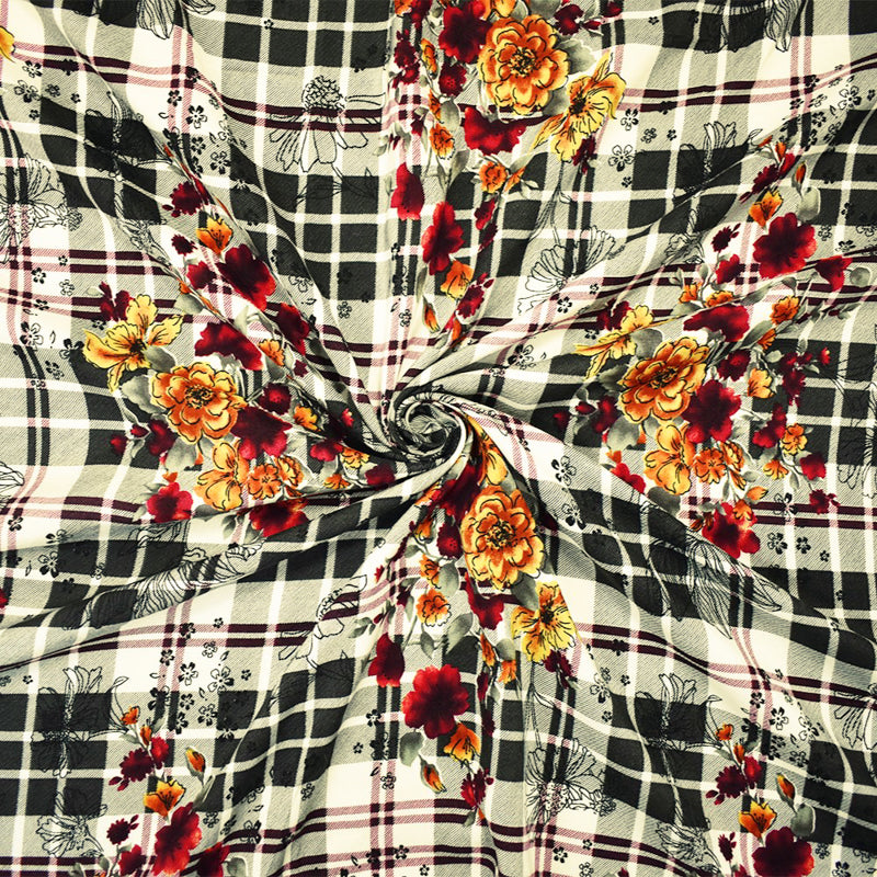 Black-Red-Multi Rayon Floral Plaid Printed Challis Woven Fabric