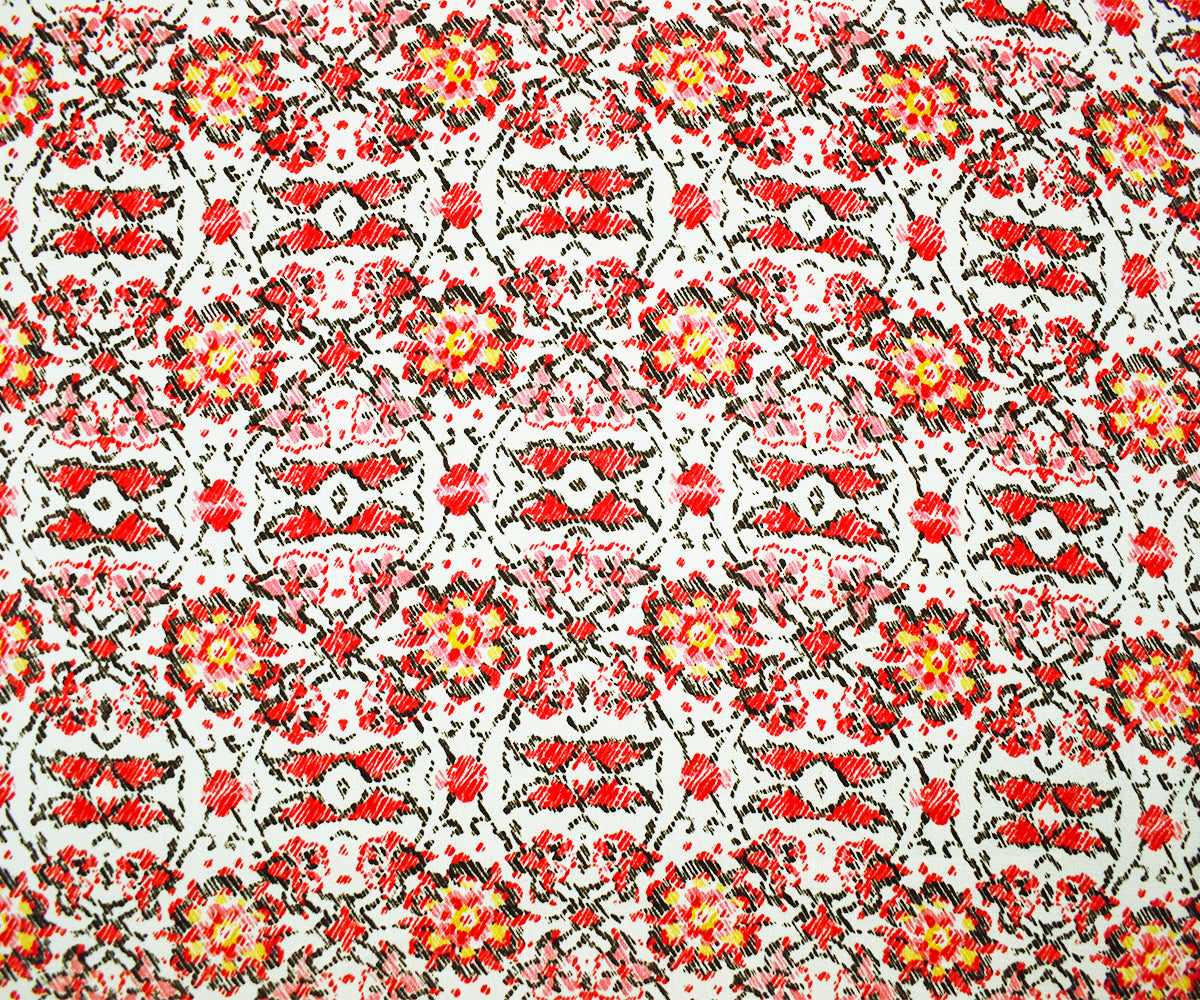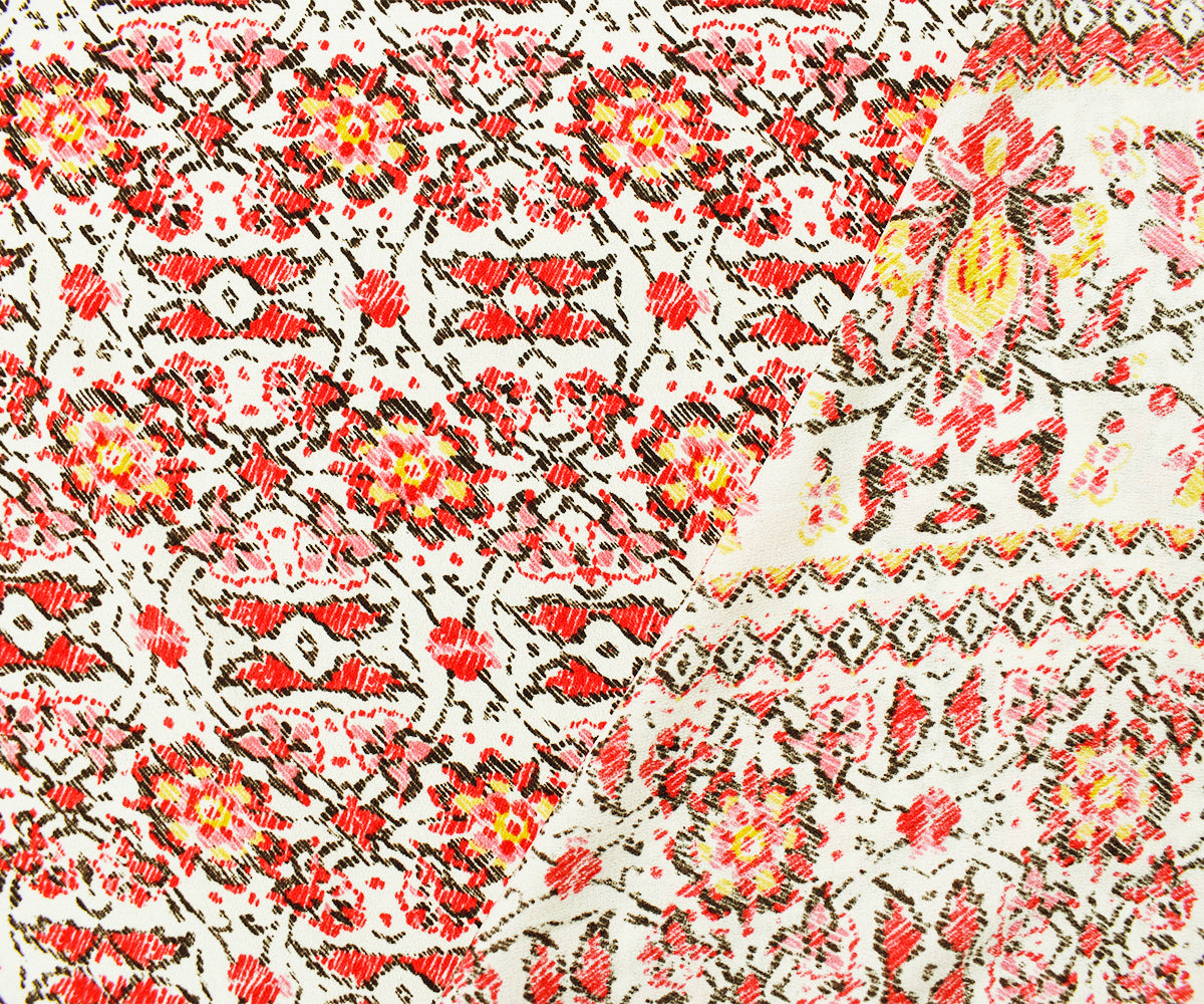 -100% polyester momie crepe dobby woven fabric printed with a stylized floral trellis pattern with a bordered style design
