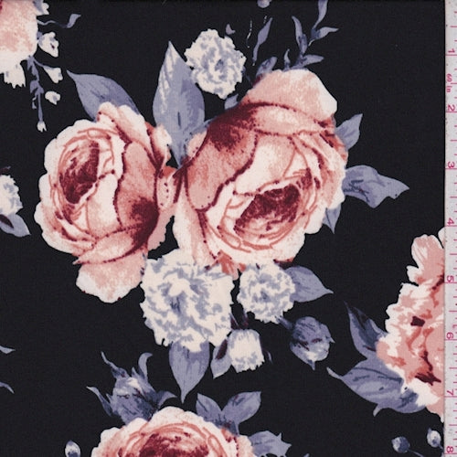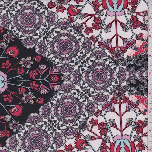 Black/White/Pink Floral Medallion Matte Jersey Knit Fabric