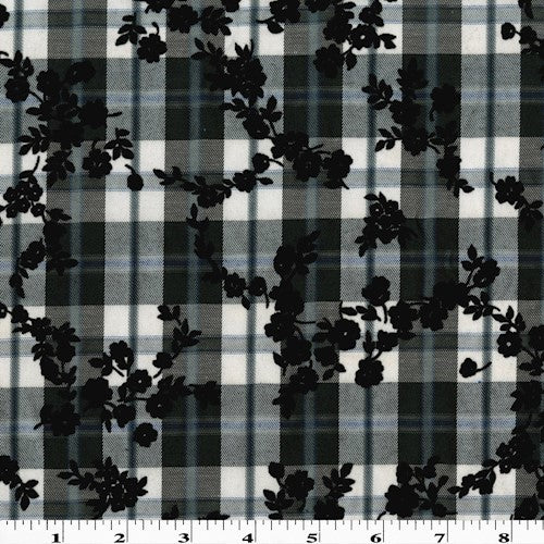 Black/Multi Velvet Flocked Floral Print Gingham Shirting Fabric