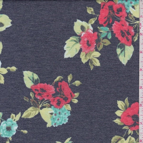 Dark Navy/Coral Floral Double Brushed French Terry Knit Fabric