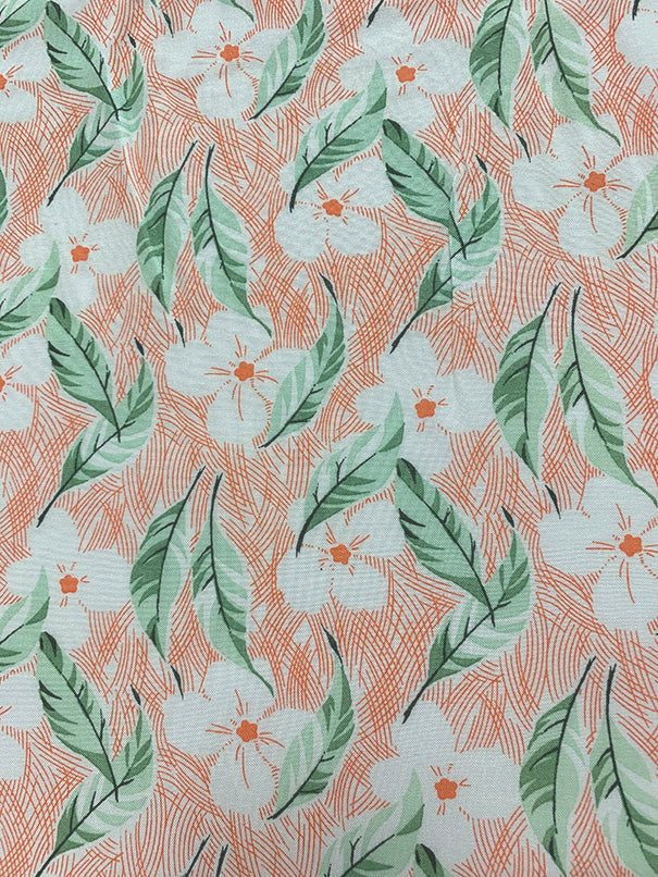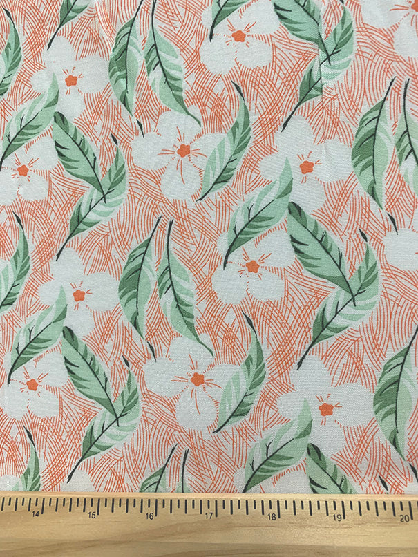 1 YD PC-White and Neon Orange Floral Print Rayon Challis Fabric