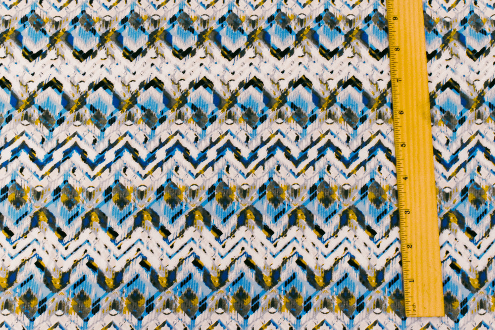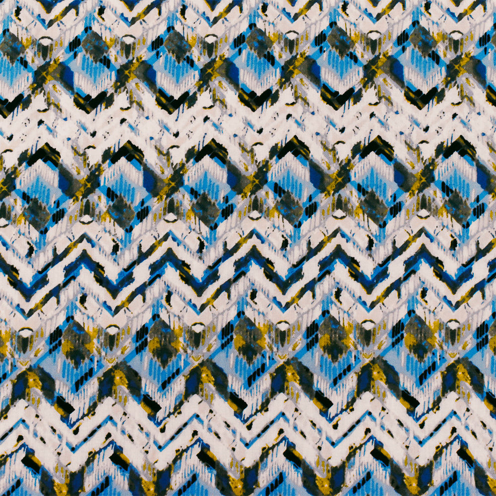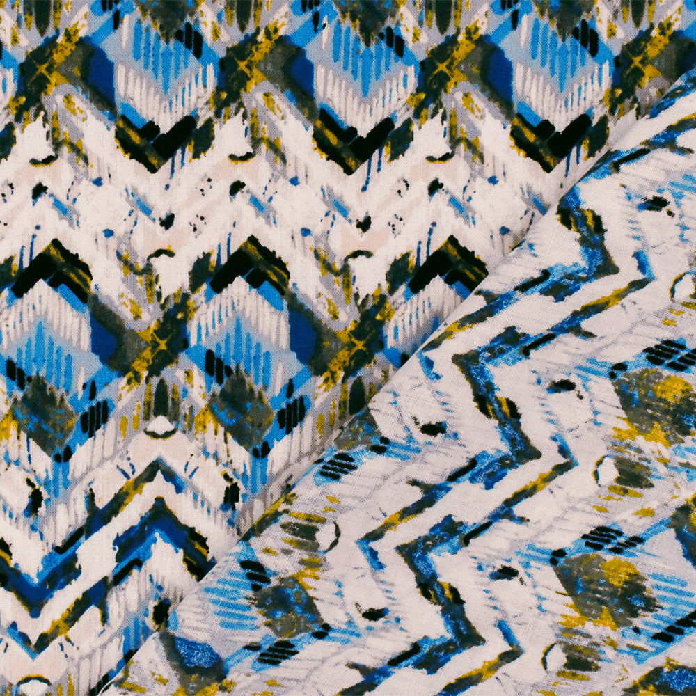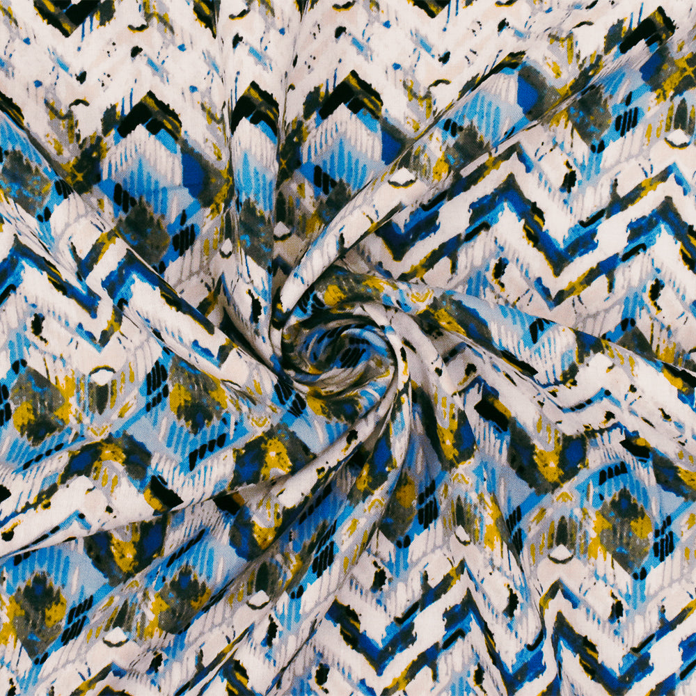 Blue-Ivory-Multi Abstract Chevron Rayon Challis Woven Fabric